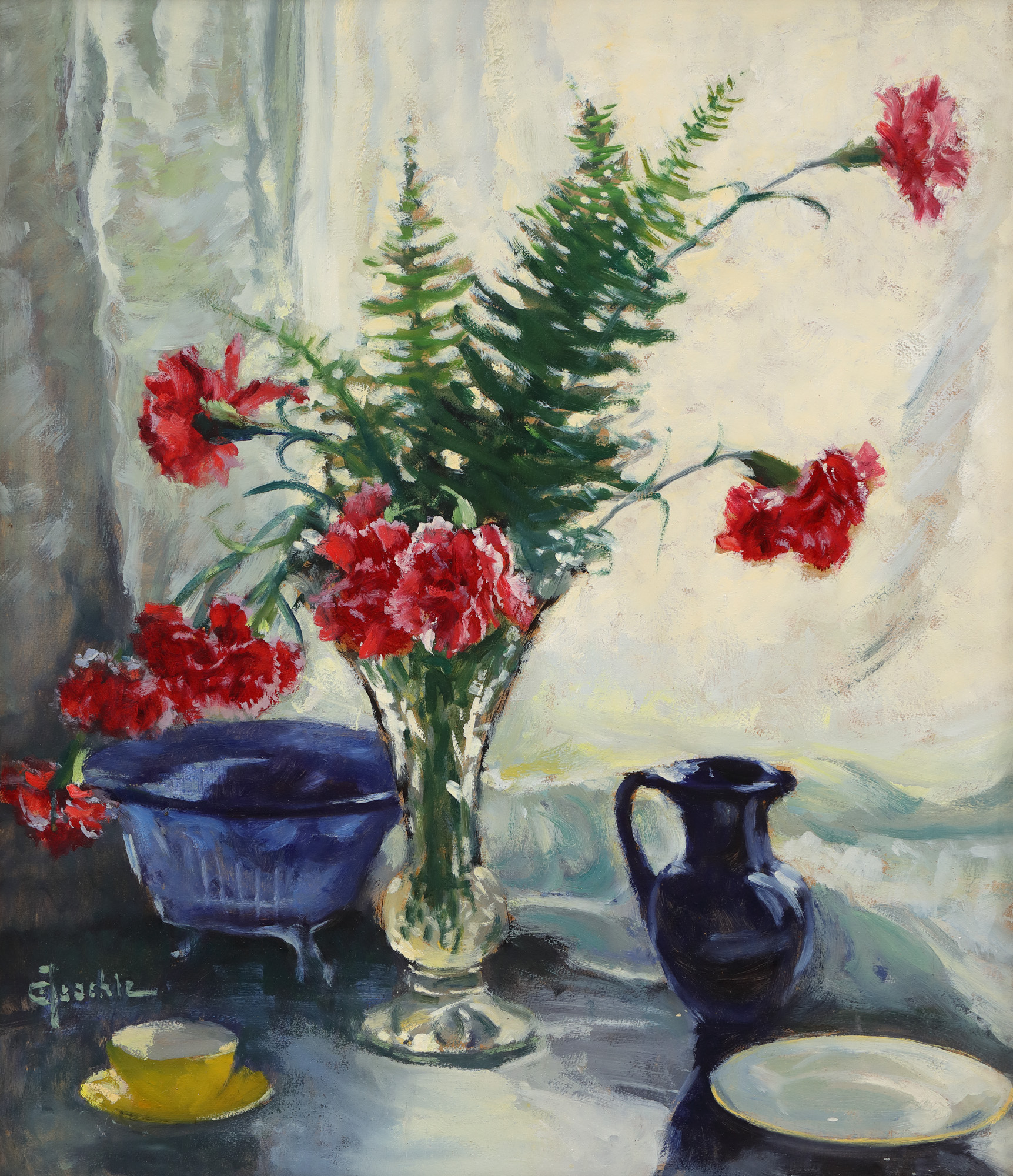 Constantin Isachie Popescu va transpune adesea în operele sale întinderile acvatice nesfârșite, scufundate în ceața dimineții, cu razele soarelui reflectându-se pe suprafața apei și coșurile fumegânde ale vapoarelor care sosesc în port. Ghidat de mama sa care îl dorea preot, se va apropia cu pași siguri de greco-catolicism și diverse personalități marcante ale religiei, ba chiar va fi și hirotonisit. Debutează inițial în avocatură, însă va părăsi baroul din Vlașca și se va dedica picturii. Reorientarea profesională va rezulta în adoptarea pseudonimului ”Isachie”. Va studia la București, sub îndrumarea lui G.D. Mirea, iar mai apoi va ajunge la studii și în Italia sau Franța. Va expune de timpuriu la Salon des Artistes Français și va fi răsplătit prin cronici elogioase în presa de la București. Va fi foarte apreciat în perioada interbelică - însuși regele Carol al II-lea va achiziționa zece lucrări de-ale sale în urma unei expoziții. După schimbarea regimului, însă, vizibilitatea artistului se va diminua considerabil, fiind aproape în totalitate exclus de pe simezele autohtone. Scriitorul și preotul Gala Galaction va deveni protectorul artistului și va întreprinde, alături de acesta și de soția sa, Letiția (fostă Mirea), numeroase călătorii. Vor parcurge împreună itinerarii dintre cele mai diverse. Vor merge împreună în croaziere (pe nava ”Dacia”) și vor vizita Serai-Burnu, Cornul de Aur, Haifa sau Mangalia. În opera lui Constantin Isachie Popescu regăsim frecvent un dialog al naturii și un conglomerat de ciocniri intense ale norilor cu apa. Însă natura nu apare, în creația artistului, doar sub forma peisajului, ci va fi reluată și în naturile statice în care ne indică, negreșit, opțiunile sale tematice preferate. Regăsim de această dată vasul cu garoafe, cana albastră și bolul din sticlă, însă remarcăm, fără îndoială, mica ceșcuță galbenă, poziționată strategic în colțul din stânga jos al lucrării, într-un veritabil contrast cu restul elementelor prezente. Dacă partea de jos a lucrării e dedicată acumulării de obiecte, în partea de sus avem de-a face cu o ambianță mult mai domolită, dominată de pătrunderea cadrului natural (lumina, în acest caz), în interior.