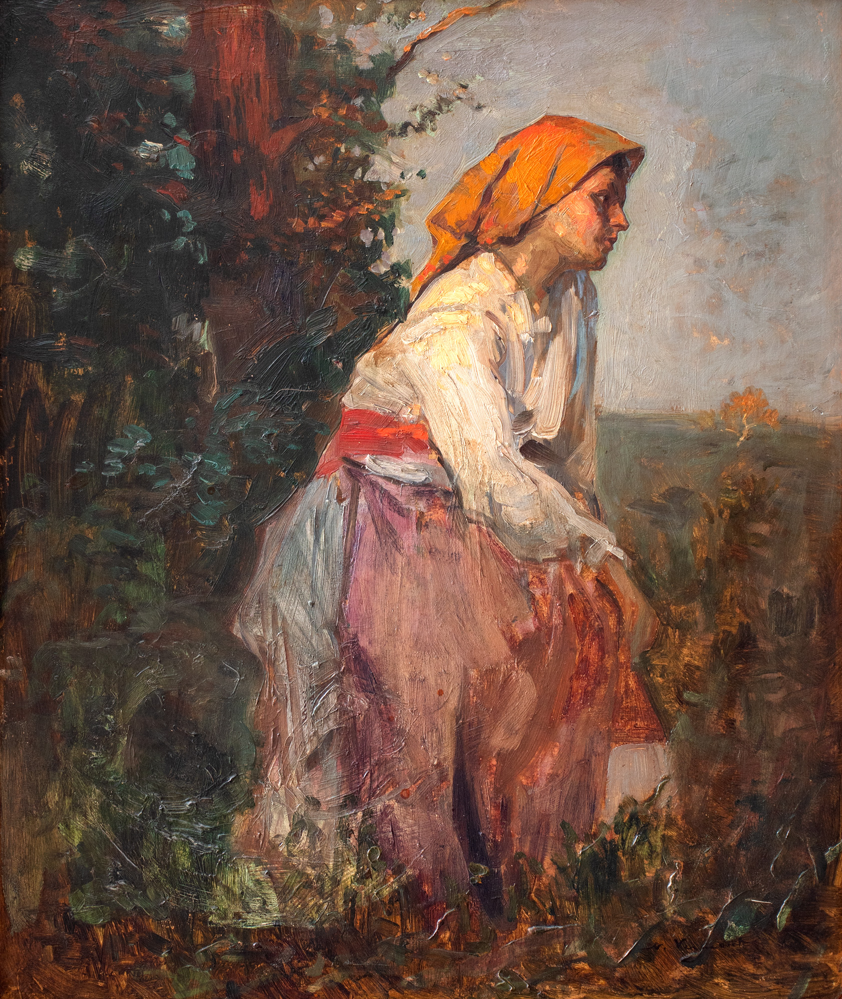 Nicolae Vermont va dezvolta apetența pentru orientarea realistă - pe care o va manifesta în majoritatea operelor sale – încă de pe băncile școlii bavareze. Măiestria sa artistică ni se relevă îndeosebi în portrete și scene de gen. Caracterul social al subiectelor alese e mijlocit de echilibrul limbajului său plastic. În opera sa, el urmărește obținerea de efecte psihologice prin organizarea compozițională și trece, succesiv, prin particularitățile impresionismului german și ale celui francez. Îndeosebi în portrete, Vermont se va concentra asupra conturării unui profil psihologic al personajelor sale, dar și asupra dezvăluirii unor caracteristici de ordin social. Linia simplă, dar sigură, înregistrează cu precizie stările sufletești și expresiile protagoniștilor. Recuzita pe care o propune artistul modelelor sale se află în strânsă concordanță cu psihologia acestora. Prin moștenirea artistică preluată de la maestrul de la Câmpina, Nicolae Vermont elaborează o lungă serie de portrete dedicate femeilor de la sat și chivuțelor. Cu siluete fragede și vioaie, țărăncuțele sale sunt zugrăvite în posturi aproape coregrafice, cu o grație debordantă și înzestrate cu straie pitorești. În paralel cu ciclul tematic dedicat chivuțelor, Nicolae Vermont se va opri și asupra femeii de la sat. Dacă în cazul celor dintâi ne vom întâlni cu ipostaze aproape statuare, veșminte colorate și nelipsitele coșuri cu flori, în compozițiile cu țărăncuțe vom observa că artistul renunță la funcția strict decorativă a picturii și își surprinde personajele în mijlocul activităților gospodărești ori în timpul muncii câmpului. Cu basmaua galbenă și șorțul colorat, protagonista operei de față, surprinsă în timpul odihnei, se înfățișează cu trupul obosit și chipul îngândurat. Artistul va împrumuta din atitudinea și starea de spirit a modelului său și peisajului, a cărui cromatică se întrepătrunde, așadar, cu vestimentația muzei.