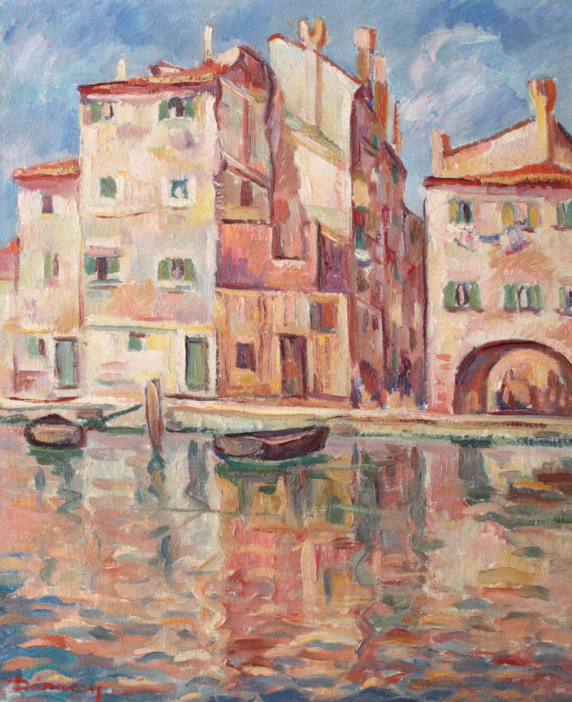 Prima călătorie pe care o întreprinde Dărăscu în nordul Italiei, la Veneția și Chioggia, se consuma în jurul lui 1910, aceeași perioadă în care Gheorghe Petrașcu descoperea și el vedutele lagunare. Este probabil unul dintre cele mai interesante elemente biografice ce îi leagă pe cei mai celebrați pictori de Veneții pe care țara noastră i-a avut. Primul ciclu cu adevărat coerent ce a surprins laguna italiană s-a conturat între anii 1914-1915, perioadă în care Dărăscu începea să depășească etapa pointilistă prin aprofundarea paletei cromatice, și mai ales prin utilizarea din ce în ce mai pregnantă a uleiului, ce căpăta din nou importanță în fața acuarelei atât de îndrăgite. În 1927, ciclul de marine realizate la Veneția primea chiar o expoziție proprie, coincizând cu cea de-a cincea expoziție personală Dărăscu, într-o manifestare aparent restrânsă, în propriul atelier, în clădirea din Aristide Briand, nr. 11 bis. Acel an puncta maturizarea paletei dărăsciene, urmându-i un deceniu în care uleiurile realizate de Dărăscu în Veneția vor deveni reper în arta românească modernă. În construirea vederilor veneţiene, Dărăscu porneşte mereu de la colţurile ce au trezit interes vizual şi, chiar dacă revizitează acelaşi colţ de mai multe ori, în ani diverși, niciodată nu se întâlneşte aceeaşi pregnanţă picturală. Peisajul îşi pierde din calităţile de pur motiv pictural, deoarece acesta resimte o mutaţie în valorificare, metodele cromatice fiind astfel încărcate de importanţă. Astfel, locurile alese de pictor au doar menirea de a oferi primul strat vizual şi, desigur, trebuie să ofere și elementele propice unei reproduceri, efect de lumină sau o perspectivă generoasă şi atrăgătoare. Acest lucru este identificabil și în cazul de față, în care Dărăscu alege un loc pe care îl recunoaștem în alte câteva picturi: prima apariție a colțului o surprindem în 1921 (vezi "Bărci la Veneția", Artmark, 2012, lot 113), însă regăsim aceeași configurație și în "Veneția", Artmark, 2014, lot 78 cât și în "Chioggia", colecția istorică I.L.Georgescu, expoziția Dărăscu 1966.
