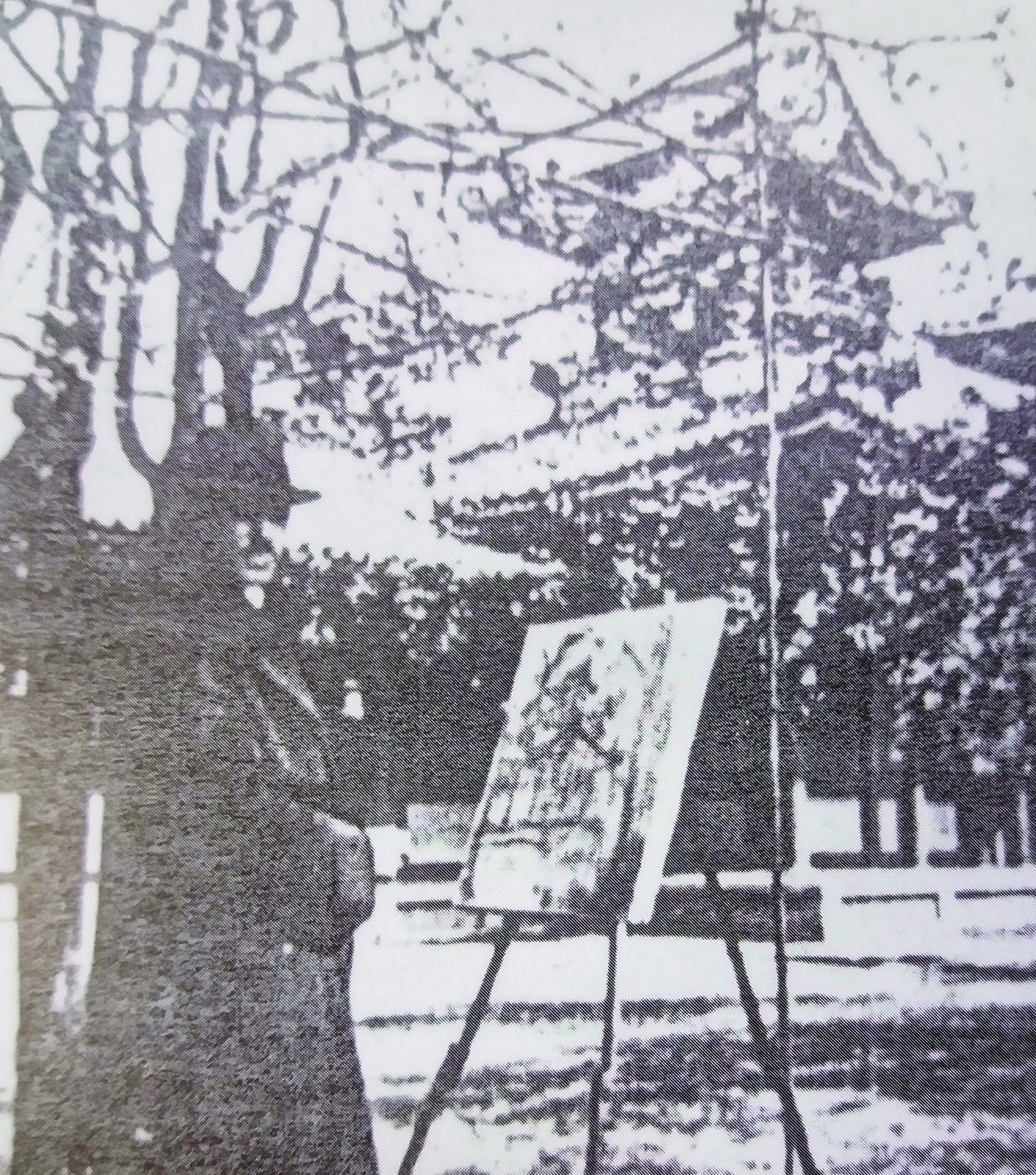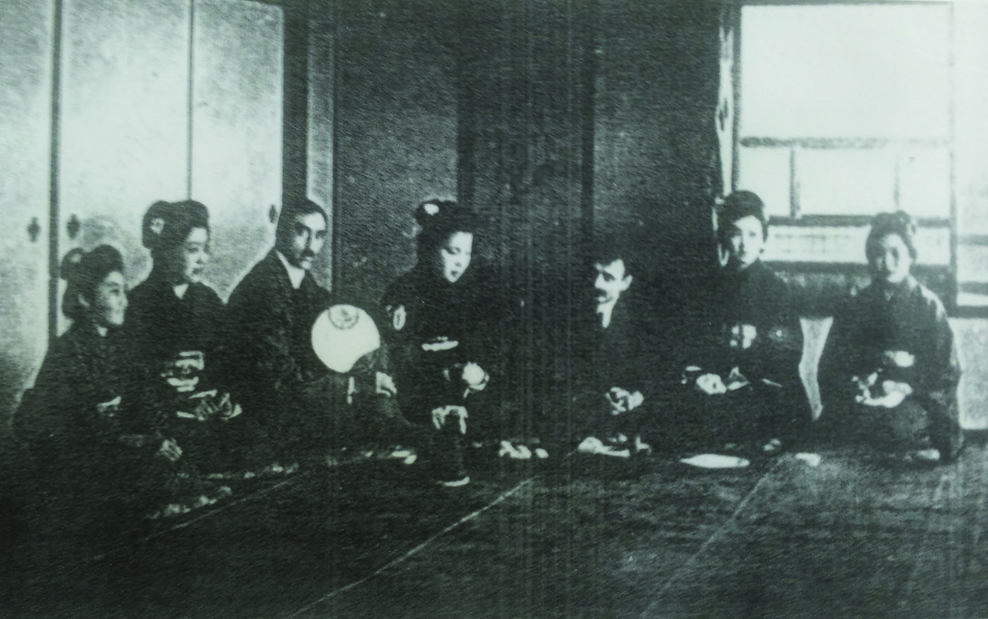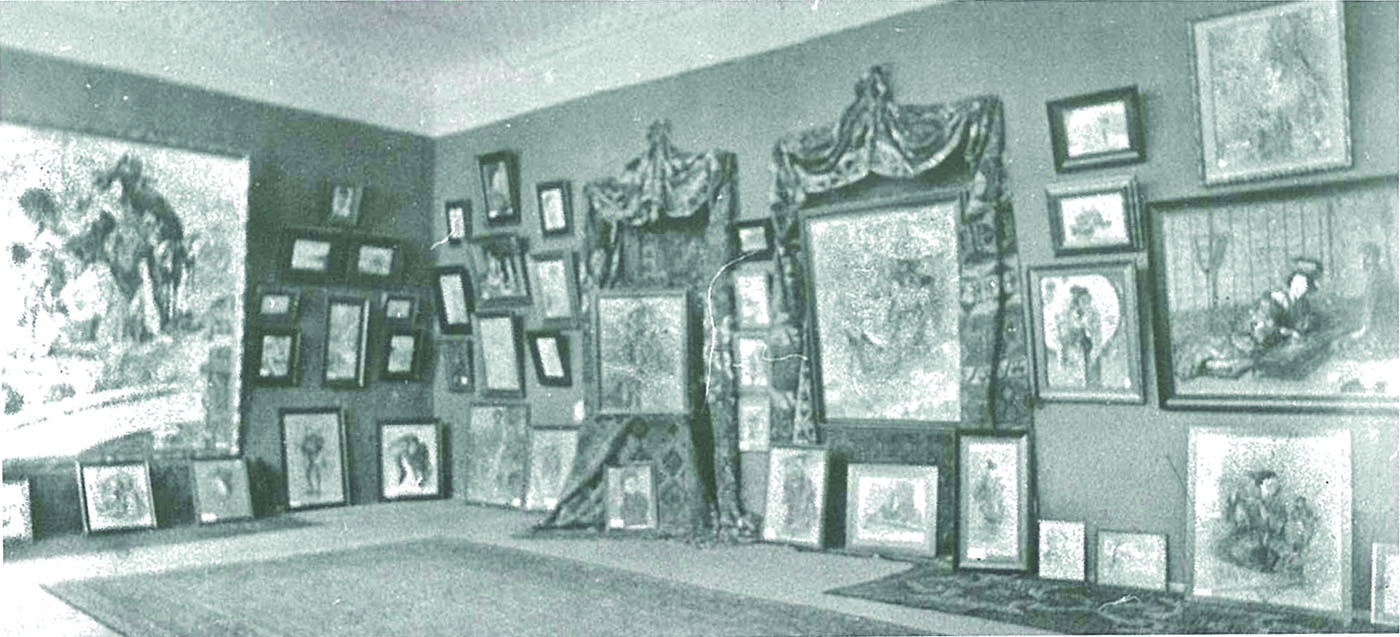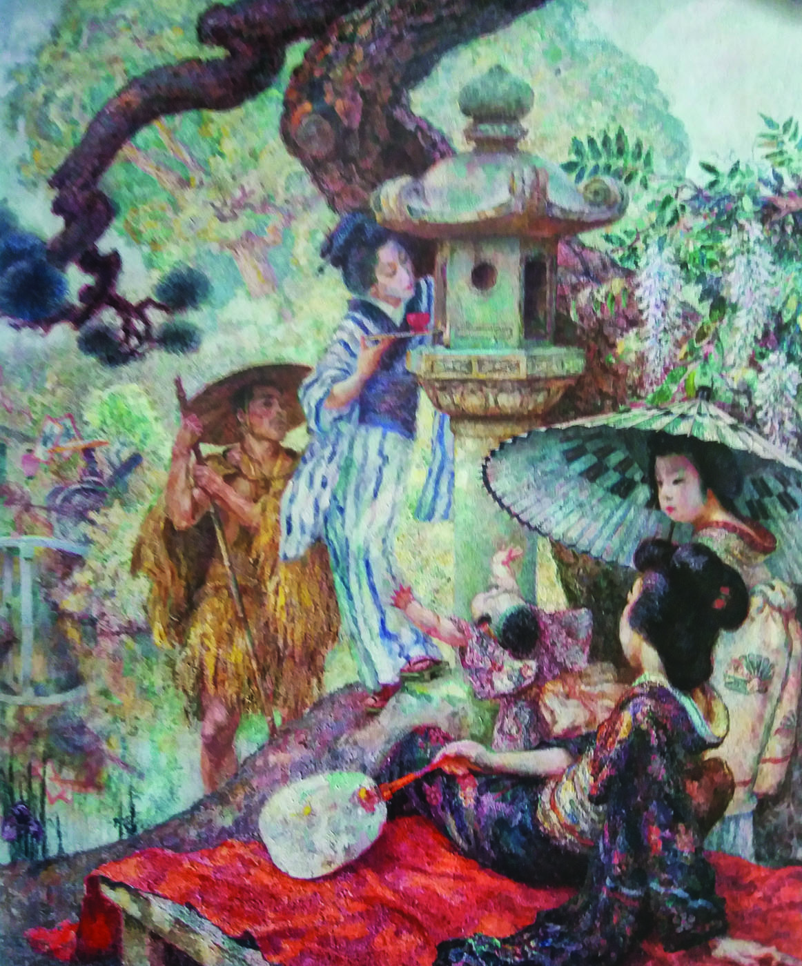 Opera a participat la expoziția personală „Le Jepon”, Calea Victoriei nr 88, vis-a-vis de Biserica Kretzulescu, 17 ianuarie - 28 februarie 1916, București. În catalogul expoziției opera este menționată la cat. 67 sub titlul „Tayou-San dans un jardin de Shimabara.” Opera a participat la expoziția personală Mützner, Ralston Galleries, New York, 567 Fifth Avenue, 28 ianuarie -11 martie 1916. Opera este reprodusă în „Pictorul Samuel Mützner în Japonia și America” de Viorica Andreescu, în „Studii și cercetări de istoria artei”, tom 19, nr. 1, pag. 67-82, 1972, București. Opera este reprodusă în „Samuel Mützner”, Viorica Andreescu, Ed. Meridiane, 1974. Expoziția Le Japon prezentată publicului bucureștean și celui newyorkez avea să fie excepțional primită de critica vremii, fiind elogiată în „New York-Herald”, „Evening World”, „The Sun”, „American Art News” sau în „The Globe”, „Adevărul” sau „Noua Revistă Română”.