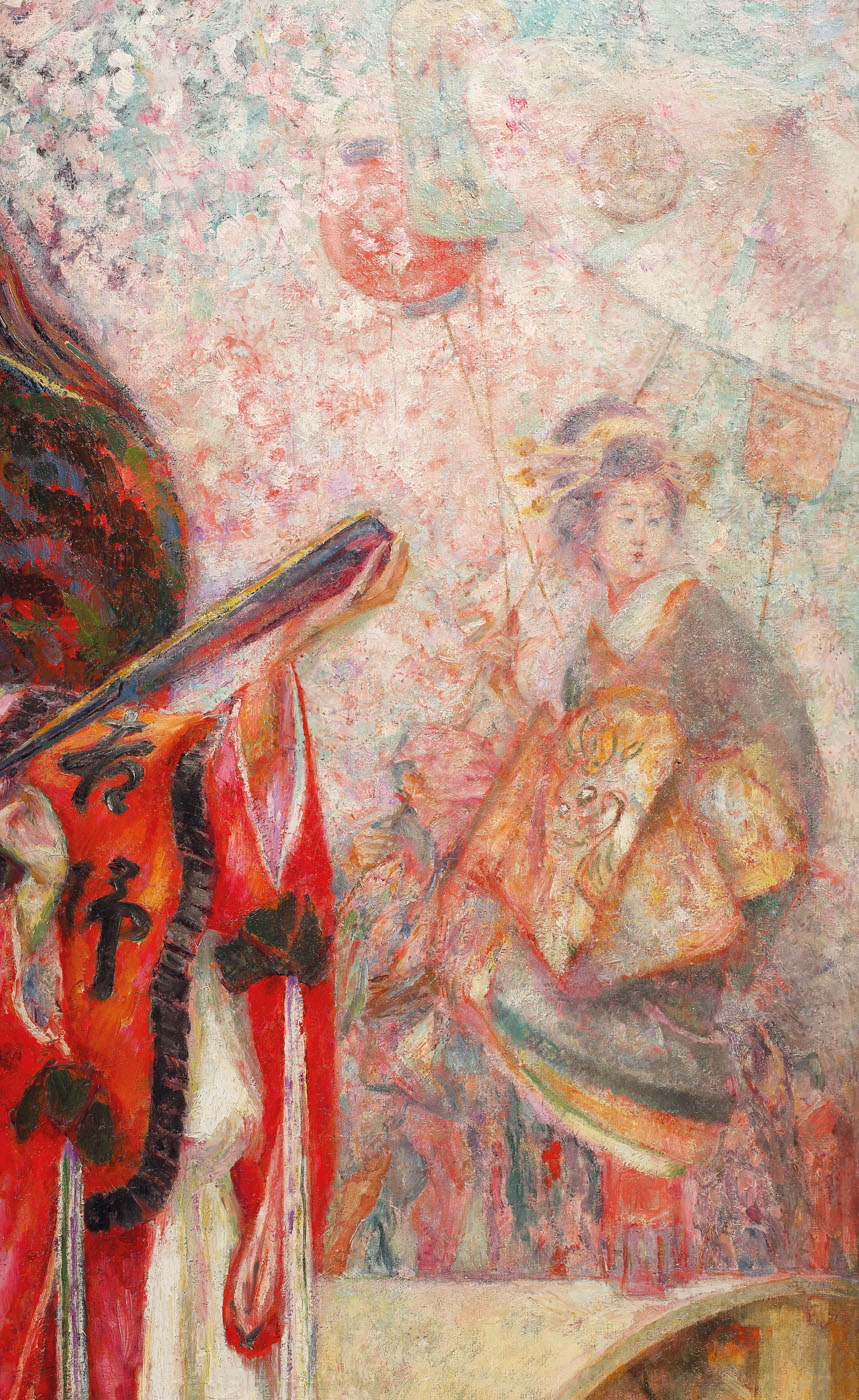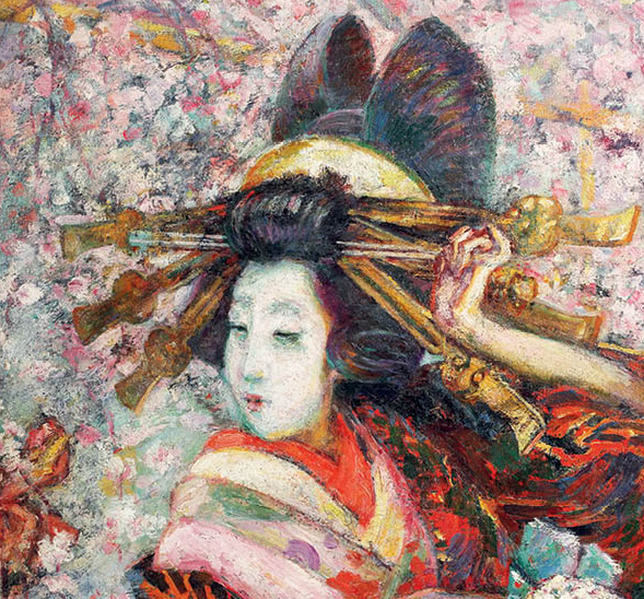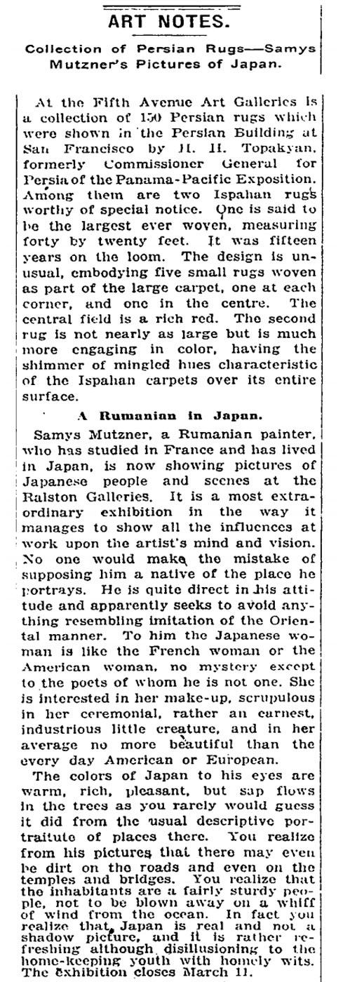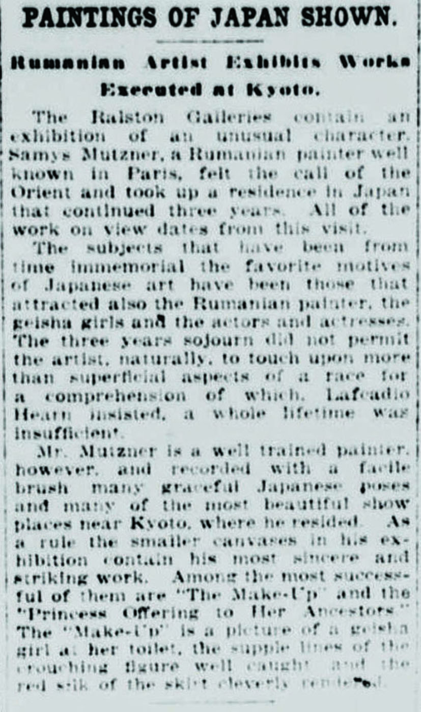 În vara lui 1912, la 28 iulie, Samuel Mützner ajungea pe tărâmuri nipone, coborând de pe vasul Tenyo Maru (printre primele transpacifice comerciale cu turbină, dotate cu echipamentele cele mai însemnate ale epocii) ce îl aducea din Honolulu în portul Yokohama. Finalul unui traseu care l-a purtat din București, prin Berlin, Paris, Le Hâvre, New York, San Francisco și Honolulu până în Japonia, concretiza un vis ce începuse să crească în sufletul tânărului artist încă de la finele deceniului întâi al secolului al XX-lea. Extremul Orient și ale lui „minuni” artistice cunoscuseră o nouă infuzie în culturile occidentale, în special în urma războiului ruso-japonez (1904-1905) care se concretiza prin resuscitarea acelui gust „japonizant”. Desigur că tânărul Mützner, avid de experimente și inovații, va căuta să își completeze itinerarul cu un sejur cu adevărat memorabil pe țărmurile insulelor japoneze. Pentru o fixare mai bună a contextului, putem aminti faptul că în perioada în care românul se afla la Paris, deci după 1906, încep să apară și studiile specializate dedicate culturii și artei nipone: Raphael Petrucci , „La philosophie de la nature dans l’art d’Extrême-Orient”, Paris, 1910; „L’art bouddhique en Extrême-Orient d’après les découvertes récentes ” în „Gazette des Beaux-Arts”, septembrie 1911. Mai târziu, într-un interviu din 1947 în care Mützner discuta despre călătoriile pe care le-a întreprins în întreaga carieră, amintea faptul că în anii petrecuți la școală în Paris, a avut un coleg de atelier japonez, Kanakogei, director la o școală de artă din Kyoto. Mai mult decât atât, biografia acestuia ne pune în evidență faptul că în timpul petrecut la Giverny, în preajma maestrului Monet, Mützner trebuie să fi intrat în contact cu colecția acestuia de stampe japoneze. Mützner, atras fără rețineri de pictura impresionistă, s-ar fi apropiat instinctiv de Japonism. Este cunoscută atracția impresioniștilor și postimpresioniștilor față de farmecul artei și lumii japoneze. Pe lângă Claude Monet și a lui colecție de 231 de stampe japoneze, multe dintre ele fiind sigur admirate de Mützner între 1908 și 1910 cât stă la Giverny, artiști ca James Whistler, Édouard Manet, Claude Monet, Vincent van Gogh sau Edgar Degas aveau să creeze influențați de lumea niponă. Românul ar fi admirat operele acestora în galeriile și muzeele pariziene, ideea călătoriei în Japonia fiind sigur influențată și de acest amănunt. Așadar premisele erau mai mult decât suficiente, iar dacă adăugăm și faptul că Mützner, tânăr adept al neo și post impresionismului, își exprima tendințele estetice prin căutări multiple, înțelegem cum noul univers devine o resursă stilistică demnă de studiat. Cu banii câștigați în urma celei de a doua expoziții personale din 1912 de la București, Mützner pleca spre Orientul Îndepărtat, unde, timp de trei ani, a reușit să străbată atât orașele importante, vechile metropole imperiale ca Tokyo, Kyoto sau Nagasaky, dar și ținuturi din Japonia profundă, ancestrală, în căutarea pitorescului autentic, străvechi, înghețat în timp. Din vara lui 1912, când ajunge în Japonia, până la începutul anului 1915 Mützner locuiește și pictează în comunitățile tradiționale japoneze. Va locui cel mai mult în Kyoto, capitala imperială la acea oră, dar și sediul principalelor instituții de artă alături de Osaka, locul marilor maeștri ai stampelor. Acolo putea să îl întâlnească pe Kitano Tzunetomi, principala figură a artelor în epocă sau să admire stilurile „Ukiyo-e” sau „Nihonga”, atât de tipice artei japoneze la începutul secolului XX. În 1915, artistul nostru avea să călătorească pentru câteva luni către China, pictând la Peking (vechea capitală imperială). În ceea ce privește creația lui Mützner din acei ani se constată lesne preponderența reprezentării feminine, a femeii japoneze în veșmintele tradiționale, în ocupații caracteristice sau în instanțe urbane. Pe lângă toate acestea apare și imaginea fermecătoare a gheișelor, opere de o senzualitate aparte în întreaga creație a pictorului. Surprinsă în interioare tipice, sau în grădinile fastuoase nipone, Gheișa primește probabil cele mai însemnate notații picturale, fiind desigur cea mai interesantă apariție în ochii unui european. Producția artistică a lui Samuel Mützner din această perioadă este însemnată, lucrând sigur peste 100 de lucrări, așa cum ne relevă acea primă expoziție din 1916, din București. Trebuie punctat și faptul că unele compoziții realizate de artist în Japonia aveau dimensiuni însemnate, fiind realizate pe parcursul a doi ani, așa cum putem descoperi din semnături și datări. Acesta este și cazul marii compoziții „Curtezane la Shimabara”, ce poartă doi ani - 1912-1913 - în dreptul datării oferite de artist. Principala evoluție punctată de sejurul de 3 ani în extremul Orient avea să se concretizeze în maniera de pictură și stil. Mânat de căutarea surselor de lumină, de o paletă cromatică exuberantă, Mützner nu numai că se regăsește în sejurul oriental, dar își modifică și maniera, depășind pointilismul tipic perioadei Giverny. Una dintre cele mai evidente evoluții pe care le regăsim și în peisajul de față constă în eliminarea totală a rigorii neoimpresioniste a tehnicii sus menționate, în defavoarea unei libertăți de exprimare atât în alegerea tușei, dar și a armoniei cromatice. Culorile preferate în peisaj, așa cum se vede și aici, sunt armonizate în nuanțe pastelate și tonuri calde. Rozul, liliachiul, galbenul solar și albastrul marin au reușit să elimine contrastele puternice, modelând afectiv o atmosferă de surdină și transparență ce se reverberează asupra formalului. Farmecul 