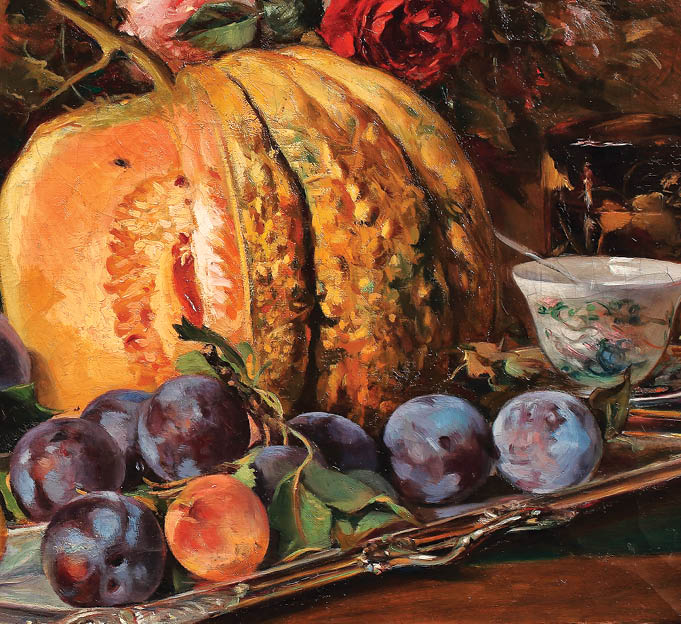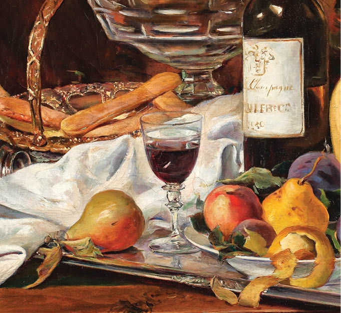 Cunoscut drept artistul român cel mai reprezentativ al picturii noastre clasice, Theodor Aman şi opera creativă a acestuia stau mai ales sub semnul epocii în care pictorul a trăit şi al schimbărilor produse, atât în câmp politic, cât şi cultural, de ideile revoluţiei de la 1848 sau de crearea statului modern. Influenţa gândirii paşoptiste şi-a spus cuvântul asupra artiştilor ca Rosenthal, Negulici, Iscovescu, Lecca (ce şi-au exprimat dragostea faţă de popor prin picturi de portrete ale fruntaşilor revoluţionari sau picturi de scene istorice) al căror respectuos continuator a fost nimeni altul decât Theodor Aman, ce s-a alăturat acestora prin intermediul tematicii istorice. Preocupările şi tendinţele istorice ale pictorului, specifice primelor perioade ale creaţiei sale, vor fi contrastate, în intervalul imediat următor anilor ’70 - ce coincide cu perioada de maturitate artistică - prin viziunea înnoitoare, eliberată de anumite rigidităţi. Chiar dacă tematica predilectă este cea a peisajului, a scenelor sub cerul liber, în grădină, în parc, Theodor Aman nu devine un plein-air-ist în adevăratul sens al cuvântului, însă paleta mai luminoasă, o mai mare libertate a tuşelor contribuie la realizarea unor compoziţii mai aerate, în care atmosfera este mult mai mult sugerată prin vibraţiile de lumină. În creația din ultimul deceniu de viață, de altfel cel mai prolific, descoperim un pictor ce își mută centrul (sau centrele) de interes. Peisajul și natura statică predomină acest ultim deceniu de viață -1880-1890, atât prin cantitate, cât mai ales prin calitate. Compozițiile mitologice și istorice își pierduseră din importanță, de asemenea și portretul își cunoscuse apogeul, singurul subiect în vervă fiind indiscutabil scena de gen. Primele naturi statice - subiecte florale- apar în primii ani de la întoarcere în București, când Aman face câteva „exerciții” cromatice, aflat încă sub influența academismului francez. După 1875 apar primele opere cu adevărat importante, opere în care poate fi observată o aplecare mai sârguincioasă asupra compoziției. Structura naturile moarte prinde contur în contextul în care Aman nu se avântă nici o clipă în experimente cromatice tipice impresioniștilor - cu care era contemporan. El rămâne fidel unui realism academic, unde instanța fotografică reprezenta un criteriu estetic important. Majoritatea operelor gravitează în jurul florilor sau a fructelor, însă există și o categorie - în care regăsim și opera de față - cu o recuzită eclectică. Obiecte personale, veselă, ulcioare, statuete și alte obiecte de mici dimensiuni compun uleiuri excepționale. Reconstrucția acestui imaginar de interior ne ajută să completăm acea imagine a fastuoaselor scene de gen cu propriul atelier. Balurile, seratele și bancheturile pictate de Aman, organizate sau imaginate în propriile săli ale casei atelier par să își găsească un pandant estetic în aceste naturi statice. Ele amintesc încă o dată de pasiunea lui Theodor Aman pentru creația artiștilor flamanzi, iar filiera din care se extrage natura statică de față este evident coordonată de creația olandezilor din secolele XVII-XVIII. Acel Pronkstilleven, în care natura statică clasică este dusă la niveluri obsecene de abundență, cu flori, mâncare prețioasă, vânat, obiecte de veselă și o multitudine de elemente decorative (tipice barocului) este evident apreciată de Aman. Filtrată și racordată la un spirit autohton, ce ținea mai mult de finețe și bun gust, de eleganță, dar și de efect decorativ, natura statică practicată de pictor în ultimii 15 ani de cartieră definește nu doar interesul stilistic al artistului, ci și gustul (uneori desuet) al publicului. Este clar că aceste opere erau direcționate unei clientele anume, Aman realizând aceste opere cu scopul precis de a le vinde țintit. Aman clasicul, romanticul și academicul reușea totuși în ultimul deceniu de carieră să deschidă noi drumuri încă o dată. Latură inedită a acestor naturi statice deschide de altfel o discuție interesantă despre dihotomia creației lui Aman din acea ultimă perioadă. Natura statică clasică se opune total compozițiilor în peisaj pe care pictorul le lucrează în acei ultimi ani, în plein air. Grădina proprie, casa fratelui sau peisajele din Sinaia și din călătoriile în Belgia vibrează către realism și impresionism, reprezentând experimente cromatice moderne, în vreme ce naturile statice reprezintă un omagiu pentru pictura maeștrilor flamanzi pe care Aman îi cunoscuse la mijlocul secolului al XIX-lea în Paris. În ”Natură statică cu fructe și vin franțuzesc” identificăm fructe (pere, prune, caise, mere și dovleac), flori, o sticlă de champagne, un surtout de table monumental, decorat cu putti, dar și o selecție de veselă și obiecte de argint pe care Aman sigur le poseda. Practica scenografierii unei compoziții o poseda încă din perioada pariziană, când își recompune romantic atelierul de lucru. Această practică o va folosi Aman așadar în construirea acestor naturi statice, unind încă o dată, la nivel estetic, procesul prin care pictorul lucra natura statică și interiorul. De o senzualitate aparte, „După petrecere” punctează încă o dată măiestria lui Theodor Aman, minuțiozitatea pensulației, viziunea decorativă și capacitatea extraordinară de a compune structuri picturale atât de atractive.