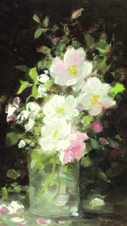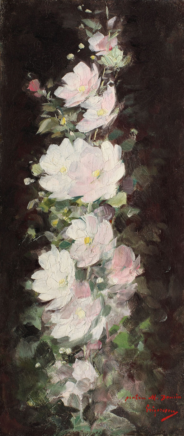 „În florile lui e frăgezimea şi respirarea umedă a vieţii, ele surâd cu strălucirea lor de-o clipă şi cu ceva din privirea ochilor omeneşti, te-aştepţi să se scuture, te-aştepţi să le vezi ofilite, moarte peste câteva minute — atâta gingăşie, atâta proaspătă lumină tremură în fiecare petală. Te gândeşti, admirându-le: ce curat trebuie să fie sufletul artistului, pentru ca, trecând prin el, spre a intra în eternitate, florile acestea de-o clipă să nu-şi fi pierdut nimic din farmecul vremelniciei lor!”. Vlahuță, îndrăgostit el însuși de panourile cu flori pictate de Nicolae Grigorescu, ne transmite emoția sinceră pe care Grigorescu o avea în fața unui astfel de tablou, unei astfel de compoziții. Bucuria picturii reiese din maniera rapidă, gingașă și plină de culoare prin care pensula redă frăgezimea și subtitlitatea naturală a petalelor și frunzelor. Tipică compozițiilor cu crenguțe înflorite de la sfârșitul secolului al XIX-lea, „Flori de măr” se reconstituie pictural pe acel inconfundabil panou de lemn vertical, îngust și perfect armonizat cu subiectul ales de Grigorescu. În plus, farmecul panoului cu flori este întregit de mica dedicație de lângă propria-i semnătură, în care Grigorescu oferă florile partenerei sale, Maria Danciu. (I.P.)