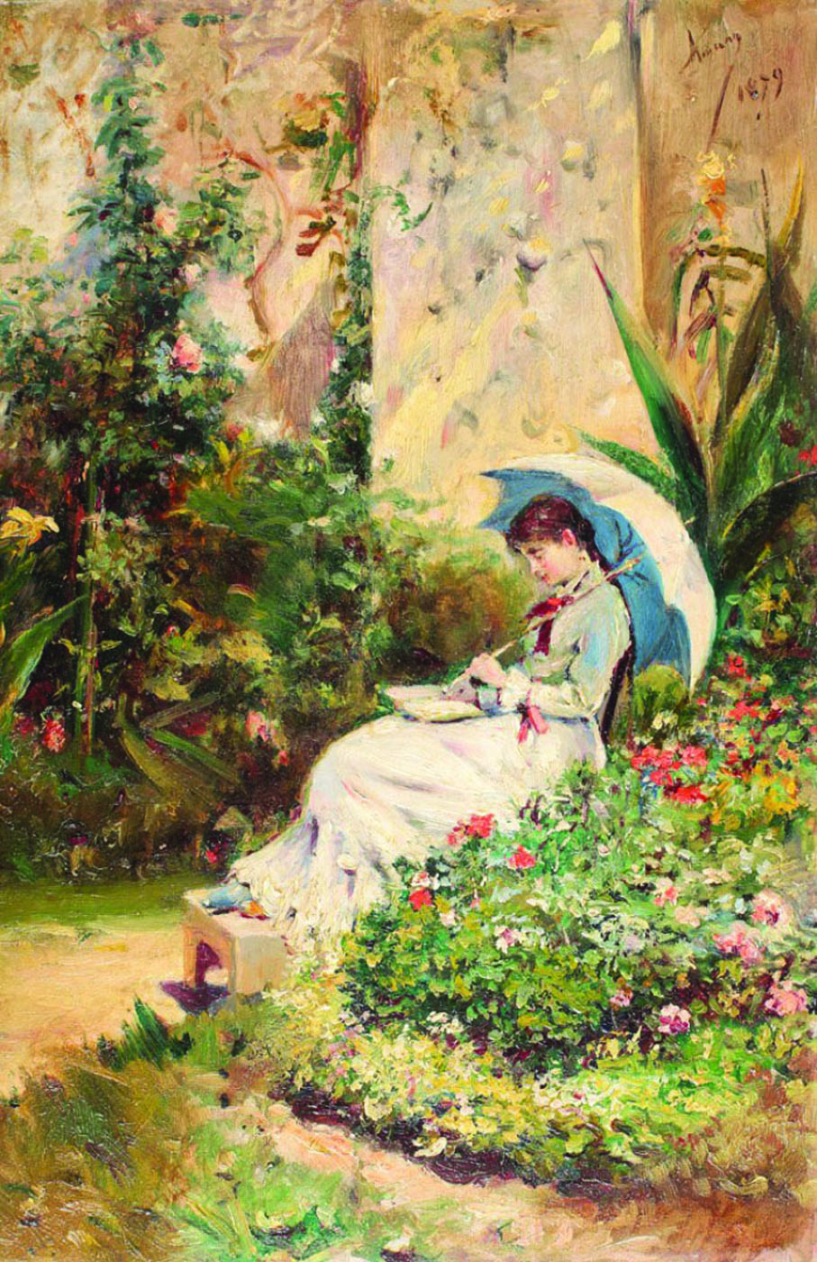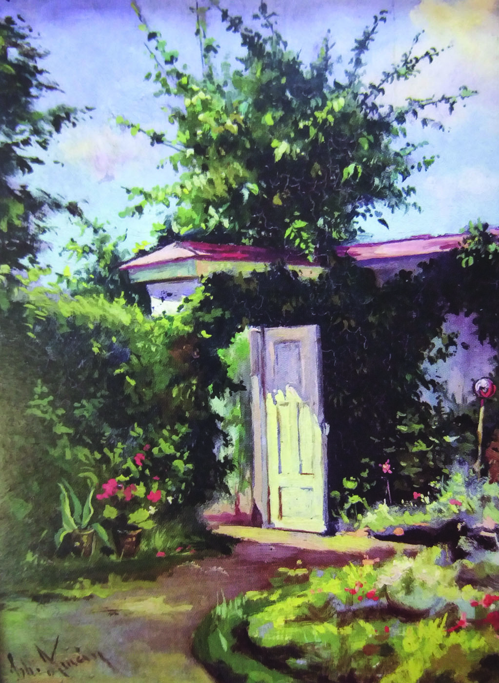 Casa-atelier, ridicată în perioada 1868-1869 pe strada Clemenței nr. 8 (astăzi C.A.Rosetti), era proiectată de însuși Theodor Aman și avea să ajungă, 40 de ani mai târziu, primul muzeu de artă al capitalei. Cei 22 de ani pe care i-a petrecut pictorul în propria-i creație arhitectonică și decorativă aveau să puncteze apogeul carierei picturale și didactice a artistului ce reforma și moderniza artele românești începând cu 1864. În ceea ce privește apariția casei în pictura lui Aman trebuie amintită mai întâi suita importantă de opere ce surprinde interiorul atelierului, cu pereți plini de tablouri și cu diverse personaje ce îmbogățesc și completează imaginea acelui atelier la modă din epocă. Față de acele opere, intitulate evident „atelierul” artistului, picturile în peisaj, din curtea casei, surprind o cu totul altă atmosferă, fiind, paradoxal, de un intimism mult mai accentuat decât cele de interior. Curtea, grădinița, calcanul casei, măsuțele și decorațiunile din grădină ne introduc în intimitatea familială a omului Aman. „Grădina artistului” face parte dintr-o serie aflată astăzi aproape exclusiv la Muzeul Aman, în care pictorul surprinde colțurile pitorești ale propriei grădini, astăzi dispărută. (I.P.)