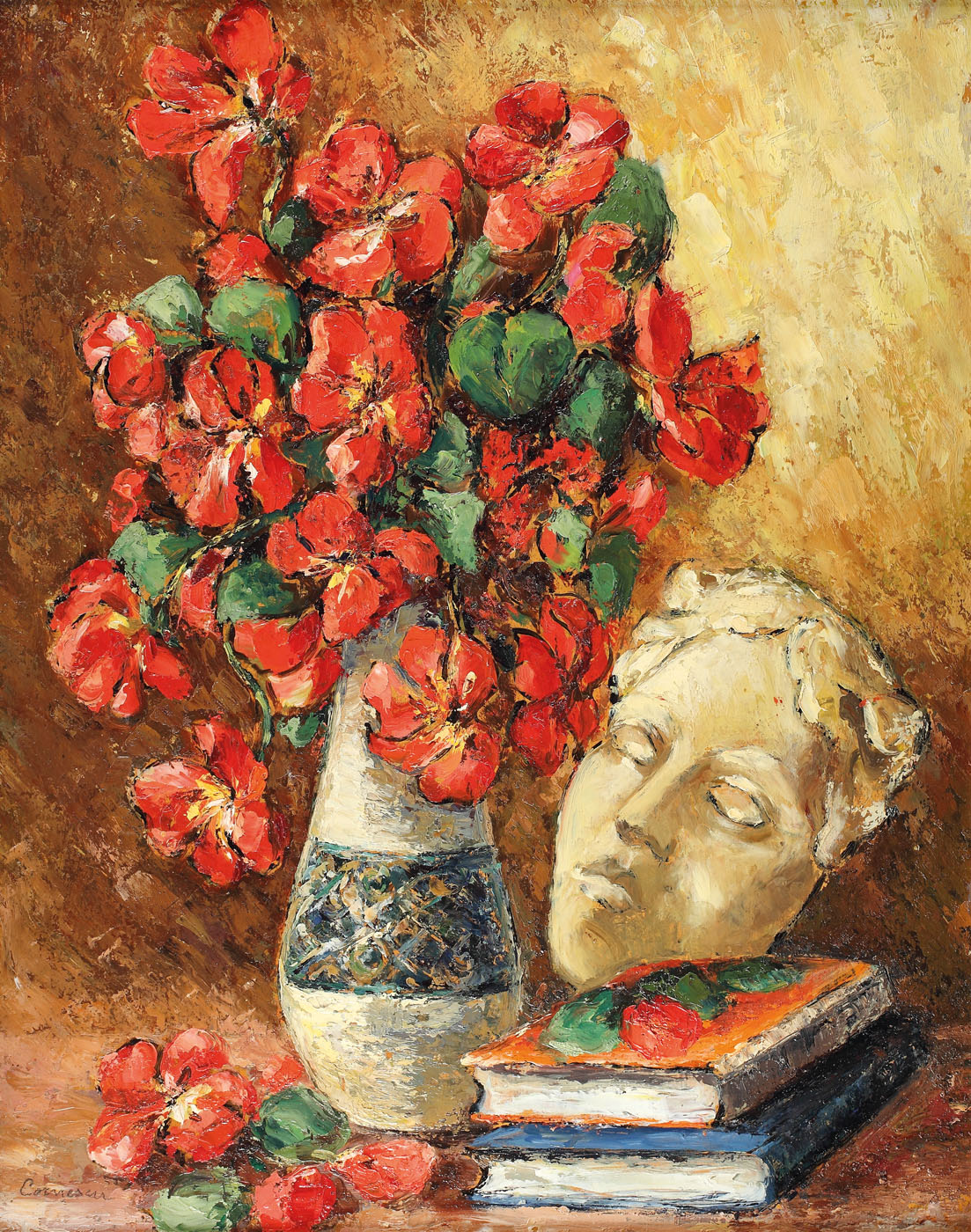 171. Natură statică cu flori de gutui și mască
