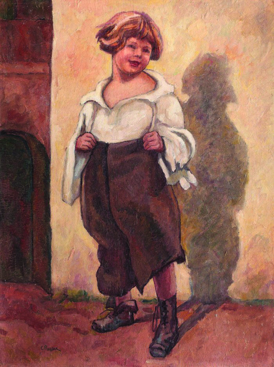 Portretul de copil apare în imaginarul lui Camil Ressu atât datorită faptului că a practicat portretul încă de la începutul carierei – “Valentin Măciucescu”(Muzeul Național de Artă al României, inv. 4597), pictat prin 1914-1915 – cât și din dorința de a crea opere mai ludice, ce s-a materializat fie în maternități, fie în diverse tablouri ce reprezintă personaje haioase , la vârsta inocenței. Fiul său a încurajat mult această practică, printre primele apariții ale acestuia fiind demnă de menționat “Fiul Artistului. Ionel”, din colecția Muzeului Zambaccian inv. 167, realizat în 1920, pe când viitorul architect Ion C. Ressu avea doar 4 ani. Prin intermediul acestei tematici a copilăriei, Ressu se “joacă” cu această sursă de inspirație, modelul – cel mai probabil tot fiul său – fiind interpretat atât prin prisma vârstei, cât și prin scenografia pe care o imaginează. La mare, în “La îmbăiat” (vezi Licitația Artmak “Cel mai iubit dintre pământeni”, mai 2013, lot 115 ), în diverse ipostaze în peisaj sau în curtea unei case, Ressu reușește să imprime cu ajutorul micuțului băiat o atmosferă ludică, iar prin tehnică și cromatică atinge note subtile ce amintesc și ele de vârsta copilăriei (culori calde sau tușa racordată la temă). (I.P.)
