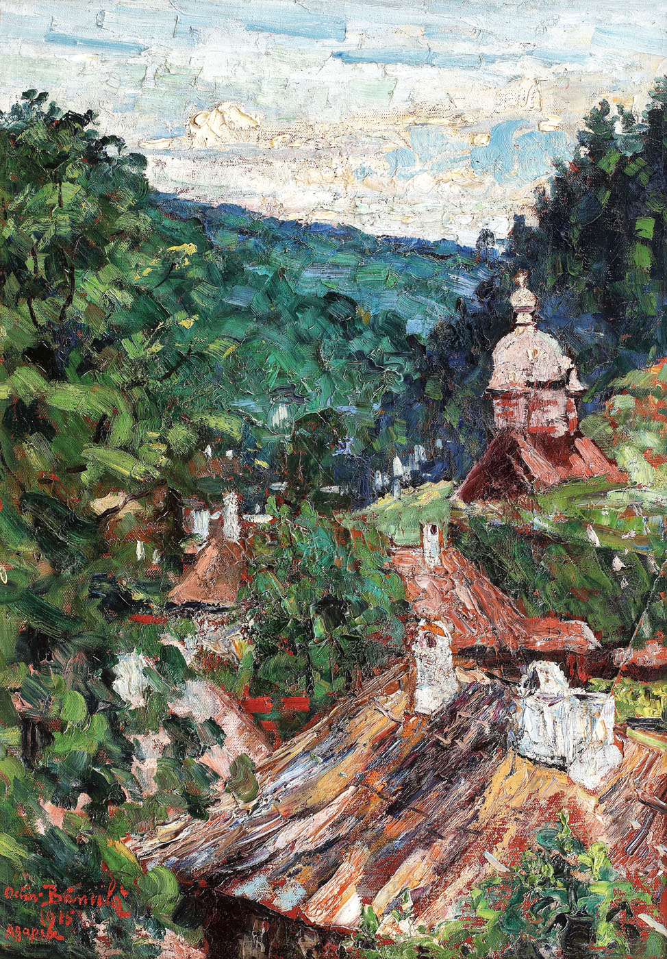 semnat, datat și localizat stânga jos, cu roșu, "Octav Băncilă, 1915, Agapia"