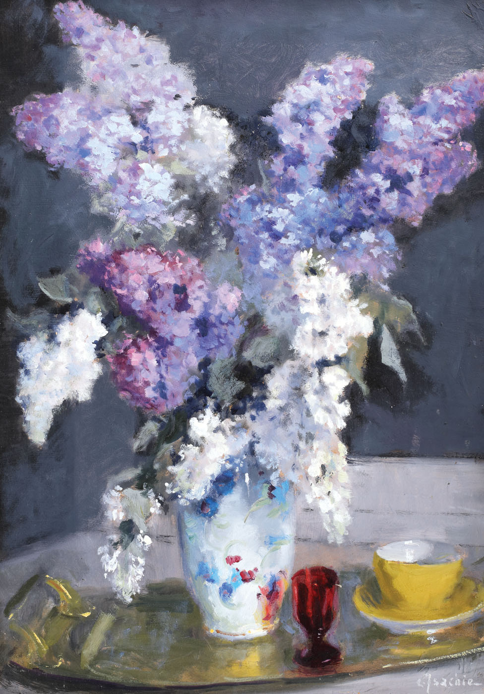 69. Natură statică cu flori de liliac și ceșcuță galbenă