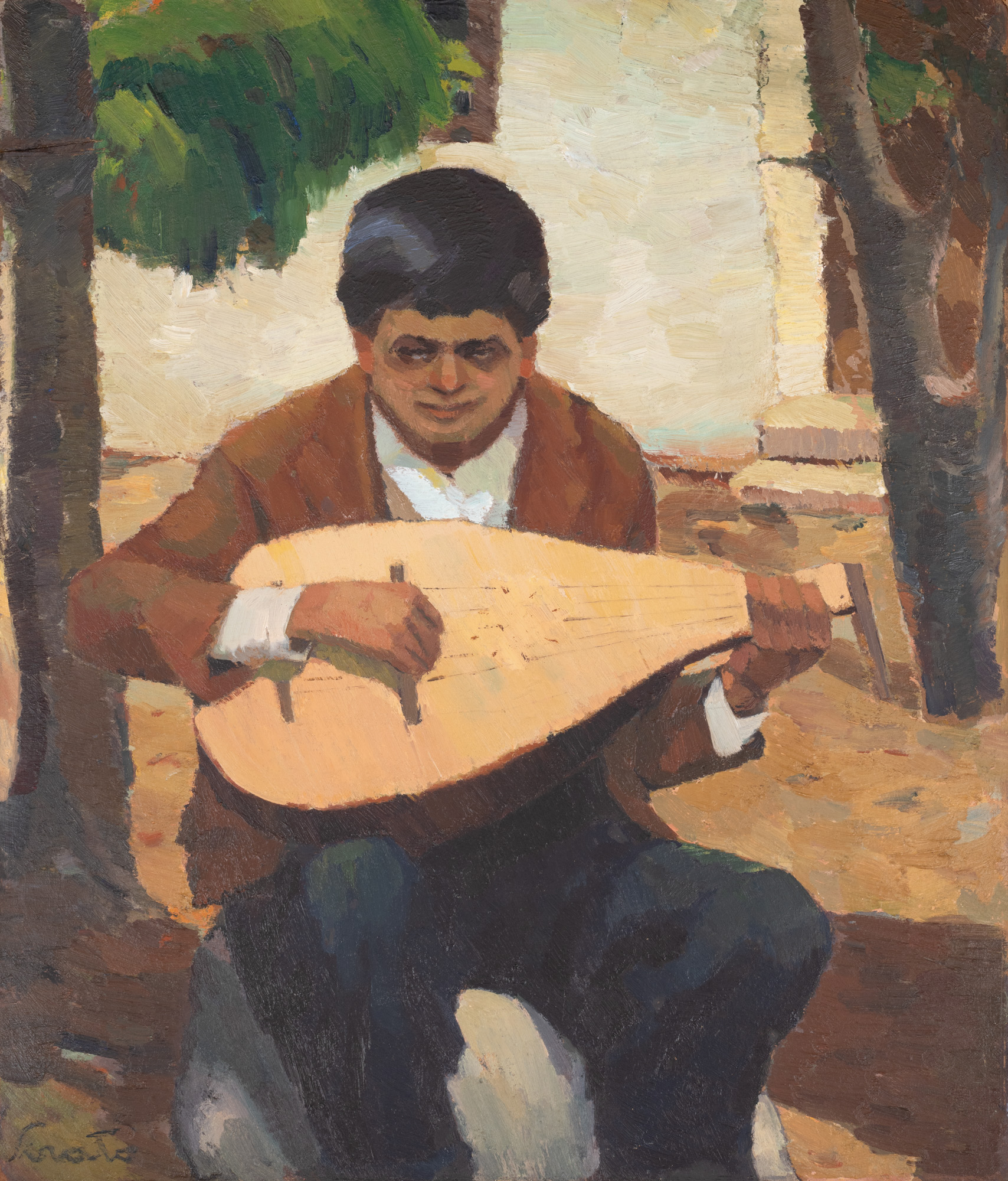 Portretele de țărani români sau turci, dar și chipurile unor personaje insolite ce apar la jumătatea anilor ’20 au reprezentat punctul de cotitură în arta lui Șirato, nu numai datorită calității excepționale a operelor, ci mai mult datorită acelei redirecționări a subiectului, ce căuta să se plaseze în concordanță cu specificul românesc, unanim propovăduit în epocă. Stilul ce va caracteriza arta lui Șirato timp de câțiva ani în deceniul trei, eminamente influențată de specificul național, va fi împământenit în opinia publică odată cu apariția compoziției “Întâlnirea”, în 1924, moment în care reputația artistului va fi un fapt statornicit. Ceea ce ne interesează direct este inovația particularităților structurale ale operei, ce devine o constantă în arta anilor ce vor urma. Viziunea monumentală, subiectul ales și maniera picturală sunt definitorii unor opere de un puternic caracter universalist, menit să ofere un tablou coerent al vieții țăranului român. Acestei lucrări îi vor urma altele, ca “Negustorul de scoarțe”, “Întoarcerea de la târg” sau “Vânzătoarea de covoare”, opere ce depășesc simplul cadru folclorizant și reușesc să atingă, sub spectrul unei arte culte, spiritualitatea populară. Aceste reușite apăreau în momentul în care Șirato începea interogațiile etnografice, având în vizor înglobarea elementului tradițional în economia compoziției, fie el reprezentat de țărani, recuzită a creației populare sau imagini de un accentuat efect pitoresc rural, cum este cazul operei de față. “Cobzarul” lui Șirato ne introduce în ciclul dedicat de artist omului simplu, cercetat asiduu încă din perioada Primului Război Mondial, fapt reflectat în special prin acuarelele din seria “Refugiații”. Alături de alte opere realizate la mijlocul anilor ’20 – “Chiaburul satului”, “Țigani din gorpile Oatu” sau “Țigan”- participante la expoziția Grupului celor Patru din 1926, “Cobzarul” consacră acest ciclu dedicat “marginalului”, mahalalalei purtătoare a unui flux cultural analizat de teoreticianul Șirato. În plan compozițional, pe lângă menționarea tipologică, pictorul construiește volumele, într-o relaționare parafigurativă. Fundalul arhitectural folosit drept liant în transmiterea unei instanțe monumentale este încărcat de elemente structurale recognoscibile și în creația unui Tonitza sau Theodorescu-Sion; astfel, verticalitatea celor doi copaci plasați în perspective diferite conferă operei un aspect cvasi-constructivist.