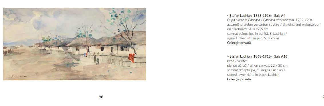 Opera a participat la expoziția "Luchian-Dărăscu", Palatul Ateneului Român, Sala Exarcu, februarie 1914. Opera a participat la expoziția inaugurării Fundației Ioan I. Dalles, expoziția "Andreescu-Grigorescu-Luchian", București, 1932, cat. 20. Opera este reprodusă în monografia "Luchian", Petru Comarnescu, Ionel Jianu, E.S.P.L.A., București, 1956 la cat. 101, pag. 141. Opera a participat la expoziţia "Ştefan Luchian", Muzeul de Artă al R.P.R, 16 iulie-10 noiembrie 1957 și este menționată în catalogul expoziției la cat. 203, pag. 87. Opera a participat la expoziția "Luchian. Peisajul și compoziția în aer liber", Muzeul de Artă al R.S.R., București, 1968 și este menționată și reprodusă la cat. 79, pag. 134. Opera este menționată și descrisă de criticul de artă Leo Bachelin în "Exposition Luchian et Dărăscu", din "La Politique", 28 feb/13 mart 1914: "Village de Băneasa, une fine aquarelle où les notes grises et bleues sont d'une délicatesse exquise". Opera este menționată în catalogul expoziției retrospective "M.W. Arnold", Muzeul de Artă al R.S.R., catalog de Georgeta Peleanu, București, 1970 la pag. VII. Opera a participat la expoziția "Luchian și Independenții", Artsafari 2017 și este reprodusă în catalogul expoziției la pag. 98. Pe verso, etichetă de participare în expoziţia "Ştefan Luchian", Muzeul de Artă al R.P.R, 16 iulie-10 noiembrie 1957.