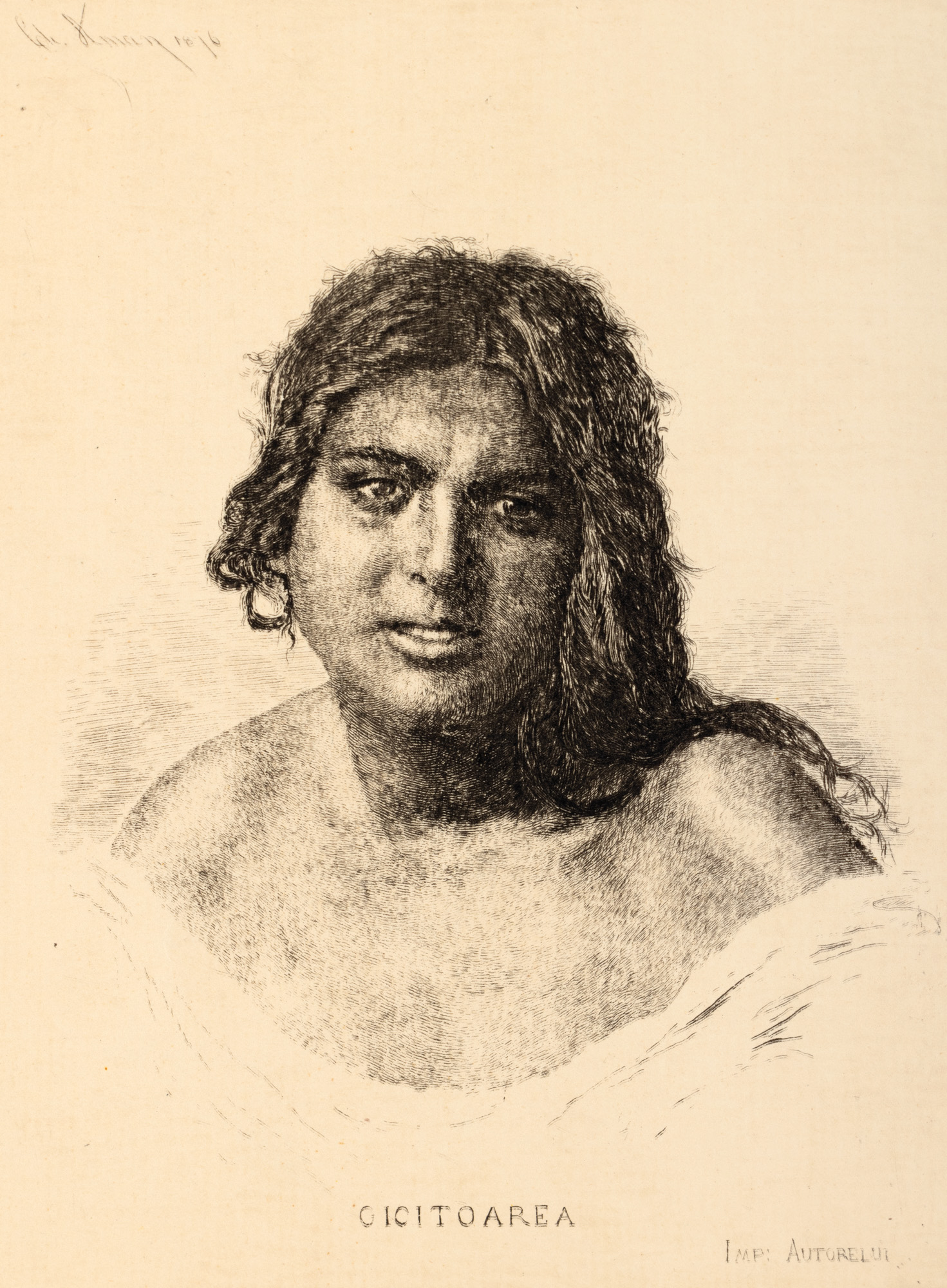 semnat şi datat, gravat, stânga sus, "Th. Aman, 1876"; inscripţie gravată central jos, sub cadru, "GICITOAREA"; inscripţie gravată dreapta jos, sub cadru, "IMP. AUTORELUI"