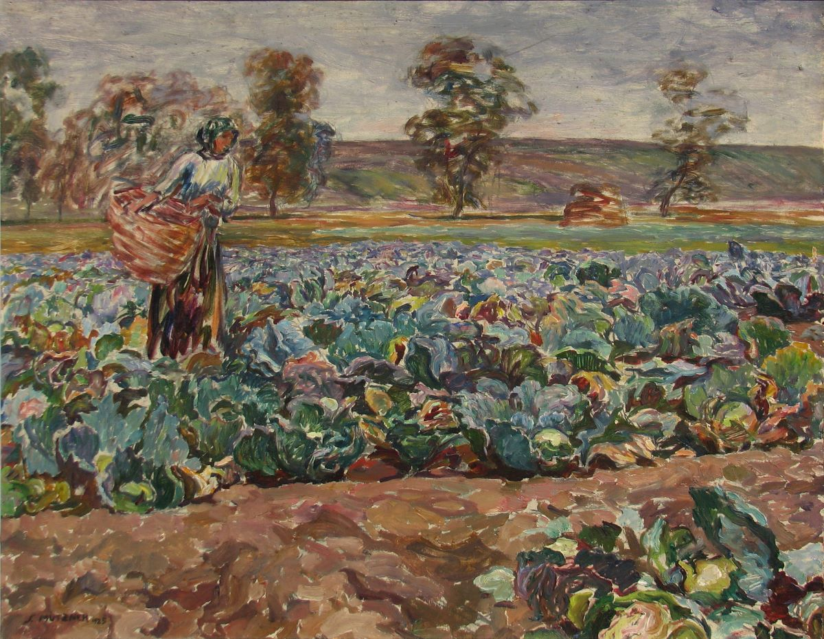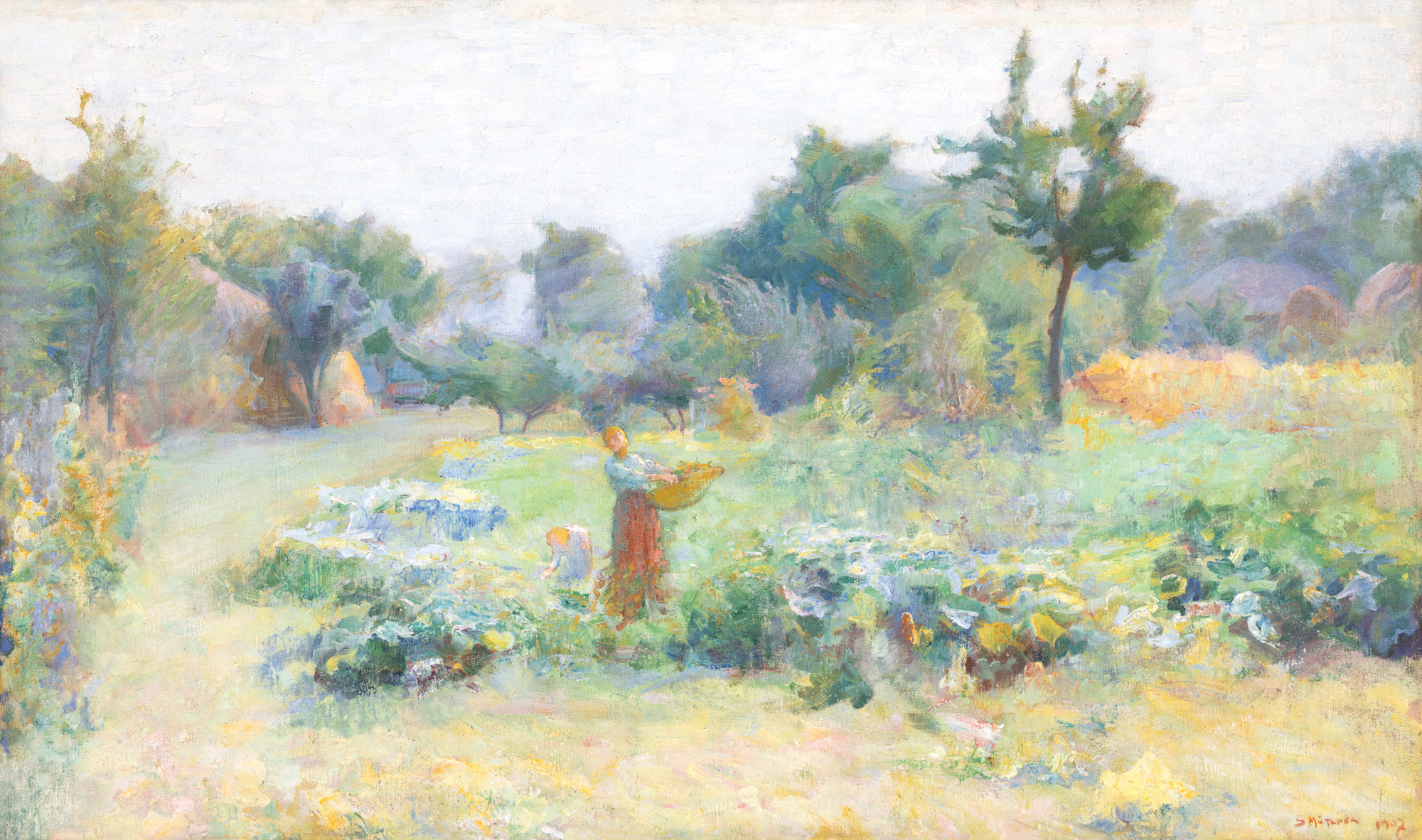 Samuel Mützner este asociat cu evoluția impresionismului autohton, alături de Jean Al. Steriadi, Nicolae Dărăscu sau Lucian Grigorescu, unde acesta s-a preocupat de descifrarea regulilor picturale care alcătuiesc relațiile dintre lumină și culoare, în acordurile veșnic schimbătoare pe care le oferă natura. Viziunea sa a fost a unui contemplator al realității din jurul său și nu a unui imaginativ, iar meritele esențiale ale creațiilor sale constau în calitățile lor descriptive și de o aleasă sensibilitate coloristică. O notă distinctivă a operei sale este aderarea la mișcarea impresionismului, Mutzner reușind să se inițieze în specificul acestei gândiri picturale în însăși apropierea de Claude Monet și de către natură, unde o regulă esențială al impresionismului și a artiștilor era desfășurarea studiilor în Franța, formându-se în mediul artistic al atelierelor pariziene, iar apoi afară, în natură. În spațiul românesc impresionismul își va găsi locul mai ales în rândul peisagiștilor, deoarece în tehnica specifică genului aceștia i-au putut adopta regulile esențiale, cromatice și luministice, cu toată libertatea impusă de propria lor sensibilitate. Mutzner va fi preocupat să lucreze cât mai mult în aer liber pentru a surprinde culorile, vegetația, tușele, dar și cele mai diverse efecte de lumină și culoare, în medii și atmosfere diferite, la ore deosebite ale zilei și în anumite anotimpuri, acesta dovedind o totală adeziune la viziunea iluștrilor săi predecesori francezi, a căror lecție și-a însușit-o deci în esență și nu numai în formă. Astfel, cea mai importantă perioadă a sa, în cadrul studiilor va fi cea a anilor 1908 -1910, unde după mai multe călătorii prin provincia franceză, se oprește și în satul Giverny, în fermecătoarea ambianță naturală, a lacului cu nuferi, a plopilor, sau a căpițele de fân, perioadă ce se caracterizează printr-o puternică limpezire a paletei, a deschiderii către lumină și a folosirii culorilor naturale unde câteva lucrări în acest sens sunt: ”Primăvara”, ”Vedere din Giverny 1907”, ”Munca în grădina de zarzavat 1925”, ”Arbori în floare” sau ”Pădure în Bretania”, unde acesta pune accent pe observarea și redarea atmosferei peisajului natural, efectele lui diverse, cromatice și luminoase, a formelor difuze, într-o masă fluidă de nuanțe pastelate, de tușe calde, largi și plăcute sau de la albastrul pal, la galbenul palid și până la verdele luminos. În ceea ce privește lucrarea de față, a reprezentării peisajului de la Giverny care poate fi încadrată tot în perioada anilor 1908 și 1910, când acesta a început să fie atras să picteze astfel de peisaje alături de Claude Monet, centrul de interes se concentrează asupra acestui peisaj natural din cadrul grădinii de la Giverny, unde în cadrul acestuia se poate observa și prezența a două personaje, o femeie și un copil. Femeia este într-o rochie lungă roșie, cu o cămașă albastră și cu un batic galben pe cap, ce pare că adună legume, într-un coș de nuiele, pe care îl ține cu ambele mâini. Lângă aceasta, se află și un copil ce stă aplecat în grădină și care are o îmbrăcăminte de culoare albastră. În cadrul lucrării, culorile se contopesc unele cu altele, de la cerul albastru deosebit cu efecte de alb ale norilor până la întinderea de vegetație din împrejurimi, galbenul căpițelor sau nuanțele deschise și închise de verde ale naturii, toate alcătuiesc perfect acest cadru natural. După această perioadă, va reveni în țară, unde 1923 va începe să surprindă viața satului ca tematică principală a operei sale. Căutările și studiile l-au purtat în numeroase locuri deosebite unde a avut ocazia să se dezvolte, să își îmbogățească cunoștiințele și să își extindă aria tematică a operelor sale.