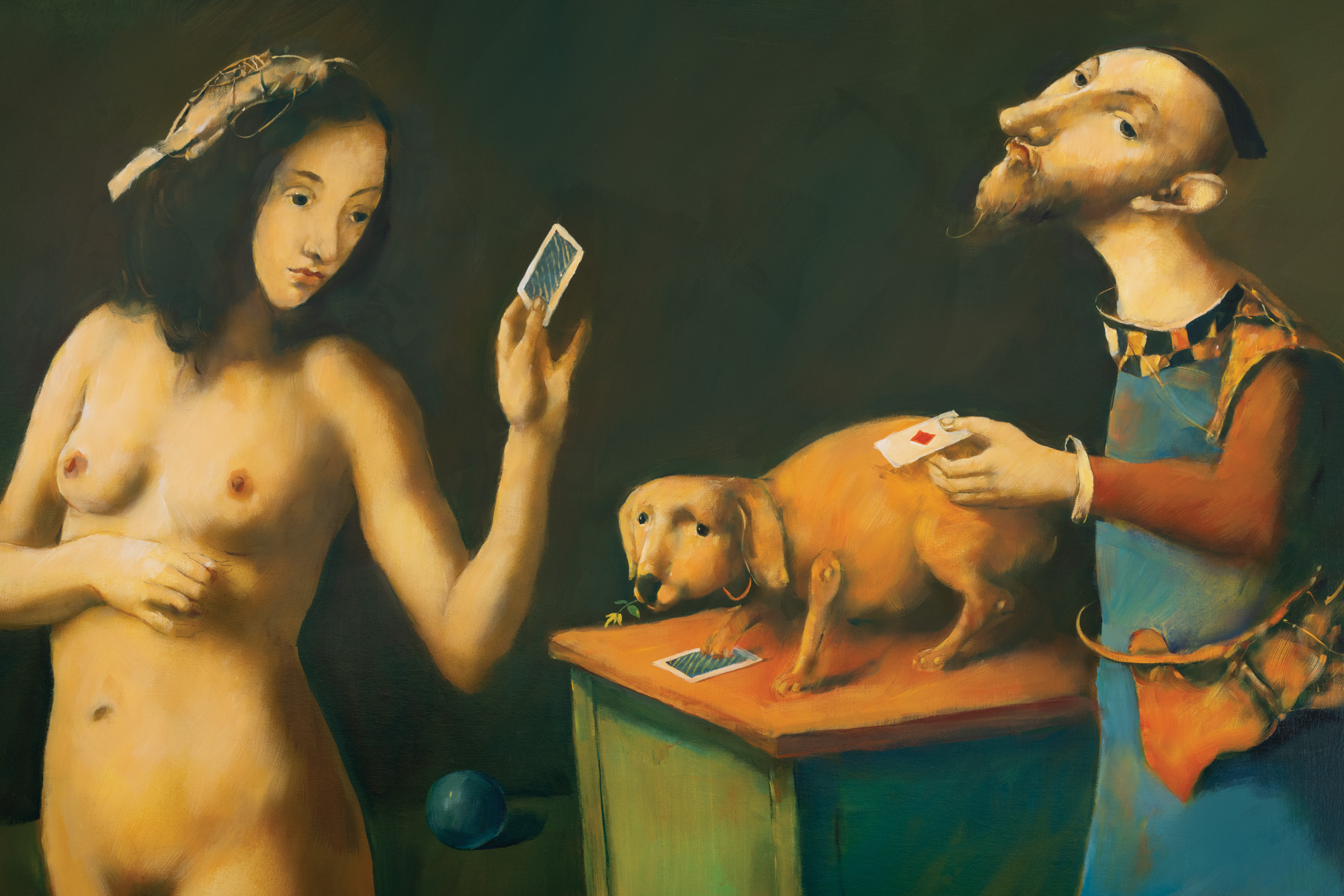semnat dreapta jos, cu albastru, "Mazilu"; semnat și intitulat pe verso, cu negru, "Mazilu, Le jeu de cartes"
