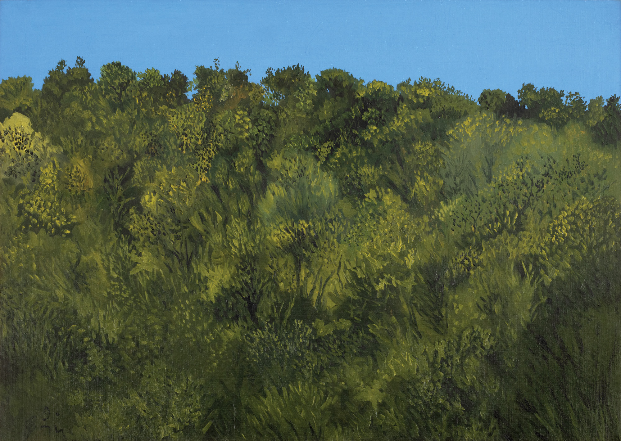 Horia Bernea considerat unul dintre cei mai importanți artiști care îmbină modernitatea și tradiția, abstractul și figurativul, punând accentul pe textura și conținutul în realizarea picturilor sale. Cel mai bine este cunoscut pentru faptul că în perioada anilor 1956-1977 este membru al grupului de la ”Poiana Mărului”, unde începe să picteze împreună cu Teodor Moraru, Ion Dumitriu și Theodor Russu. Pentru Bernea ”Poiana Mărului” are o însemnătate foarte importantă, deoarece reprezintă locul unde acesta a copilărit și apropierea pe care o are cu natura și cu aceste locuri. Grupul de la Poiana Mărului a trecut de-a lungul timpul prin mai multe faze de creație. Printre cele mai importante putem aminti, prima fază de creație și de început a grupului (1961-1969), unde aceștia se familiarizează cu peisajul și cu abordarea unor teme simple din natură. Această primă fază se diferenţiază de faza următoare, a anilor 1970 -1980, nu numai prin componenţa grupului, dar şi prin abordările stilistice şi, parţial, prin opţiunile tematice ce devin mult superioare celor inițiale.Multe dintre temele lui Horia Bernea din perioada anilor de început 1960-1970 se concentrează asupra unor cicluri tematice specific lui precum cele dedicate dealurilor, hranei, portretului, grădinilor sau interioarelor de biserici (,,Deal”), (”Hrană”), (”Grădină în oglindă”), (”Oval labirintic”), (”Rețea”) sau (”Interior de biserică”). În ceea ce privește reprezentarea peisajului de față, ce poate fi încadrat tot în perioada anilor 1970, Bernea a redat o natură cât mai exactă și cu cât mai multe detalii asupra acesteia. S-a concentrat să creeze un peisaj cât mai natural, cu un cer albastru intens fără nori, ce se contopește cu întinderea masivă de vegetație din depărtare, vegetație ce pare că atinge cerul și ce creează în același timp o imagine vizuală plăcută. A știut să combine culorile și să creeze o paleta cromatică vie și proaspătă, cu accente puternice și intense, toate îmbinându-se perfect cu acest cadru natural deosebit. Aceste teme nu sunt simple priveliști poetice ale unei regiuni de mare frumusețe, ci imagini care transmit materialitatea unui spirit al locului. Cunoscut pentru reprezentarea unor forme vibrante și colorate ale naturii, alte exemple de lucrări similare ca cea de față, unde se poate observa în continuare această apropiere de natură, atenție și preocupare pentru peisajul natural din perioada anilor 1960-1970 aduce în atenție mai multe lucrări intitulate ”Peisaj Poiana Mărului”, (1965 și 1966), ”Deal”, ”Deal V” (1976), ”Peisaj pe Valea Tazlăului” (1980), ”Verde și ud” sau ”Peisaj la Măgura”. Începând din anii 1970-1980 apare o nouă etapă de creație în cadrul grupului ce se caracterizează printr-o unitate stilistică şi tematică mai bine realizată decât se întâmpla la început. Noile tendințe din cadrul grupului se vor concentra asupra temelor realismului și expresionismului conceptual. Din punct de vedere tematic, tot în perioada anilor 1970 încep să apară de asemenea și teme noi de interes în cadrul grupului precum: căpiţe, copaci, porţi, coloane, ferestre, capete de bârnă, unelte, șură sau ciclurile „hranei” (cartofi încolţiţi, mere sau pâini).