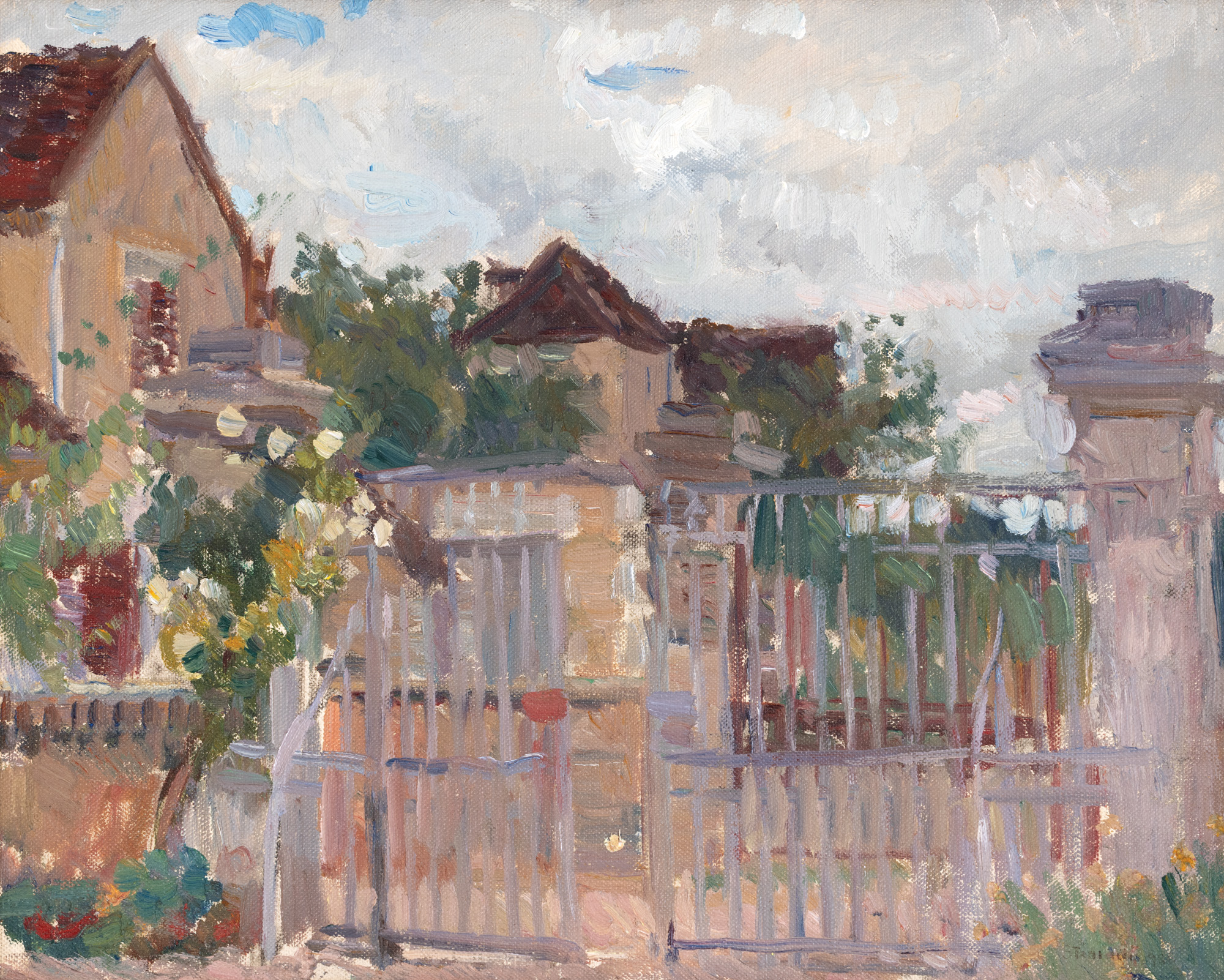 Jean Alexandru Steriadi considerat una dintre figurile cele mai de seamă din pictura românească, un continuator al pictorilor Grigorescu și Luchian, acesta reușește să îmbine transformările și particularitățile vieții cotidiene și să le reflecte în cadrul operei sale. Se înscrie la Școala de Arte Frumoase din București, unde lucrează sub îndrumarea profesorului G.D. Mirea, în clasa de pictură, iar apoi studiează timp de patru ani la Munchen, unde preia noțiunile teoretice, particularitățile tehnice pentru realism, în timp ce în cadrul studiilor de la Paris învață noțiunile necesare desfășurării planurilor de lumină și de valorificare a paletei cromatice. După întoarcerea de la studii în perioada anilor 1907, va începe să participe la viața artistică, organizând prima sa expoziție personală, urmată în 1910 de o a doua în sălile Ateneului din București, expoziții ce au avut un caracter retrospectiv. În cadrul peisajelor, datorită studiilor de la Paris, acesta reușește să surprindă lumina și să valorifice paleta cromatică a acestora într-un mod deosebit, peisaje ce încântă prin cromatica lor diversă și vie, dar și prin siguranța tușelor. În momentul realizării unui peisaj, Steriadi se concentrează pe observarea și vizualizarea detaliilor, pentru a le putea integra natural în cadrul acestora. Mâna sigură și fermă a sa dau siguranță, formă și contur lucrărilor. Peisajele se realizează dintr-o dată, fără reveniri și ajustări asupra conținutului, cu trăsături rezumative ținând cont mai ales de distribuția umbrelor și a luminilor. După fixarea liniilor mari ale compoziției, el revine cu pete de umbra, uneori realizate cu degetul, pentru a evoca și surprinde mai bine lumina ce se joacă pe suprafața detaliilor din natură, unde câteva exemple în acest sens sunt: ”Peisaj din Verre (Olanda)”, ”Peisaj din vechiul Bucuresti” sau ”Marină (Balcic)”. În ceea ce privește lucrarea de față, care poate fi încadrată în perioada anilor de după întoarcerea acestuia de la studii, în prima jumătate a secolului XX când artistul începe să realizeze astfel de lucrări, în care centrul de interes este asupra reprezentării orașului și a vieții cotidiene, și aici, în cadrul acesteia, se poate observa aceeași idee a conturării și accentuării acestei teme, a unei case cu grădină și curte din centrul Bucureștiului. Lucrarea înfățișează o perspectivă amplă a unei case cu grădină și curte bogată din centrul Bucureștiului. Peisajul este unul natural, obișuit, de primăvară, cu pomi înverziți, cerul este redat vibrat, în tușe scurte de tonuri deschise de albastru și alb. Pensulația este una caldă, cu tușe variate și rapide. Compoziția este echilibrată din punct de vedere cromatic, unde în cadrul acesteia se pot observa tonuri diverse de albastru, nuanțe de verde, accente de roz, alb și roșu.