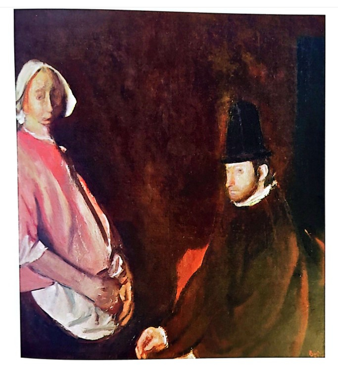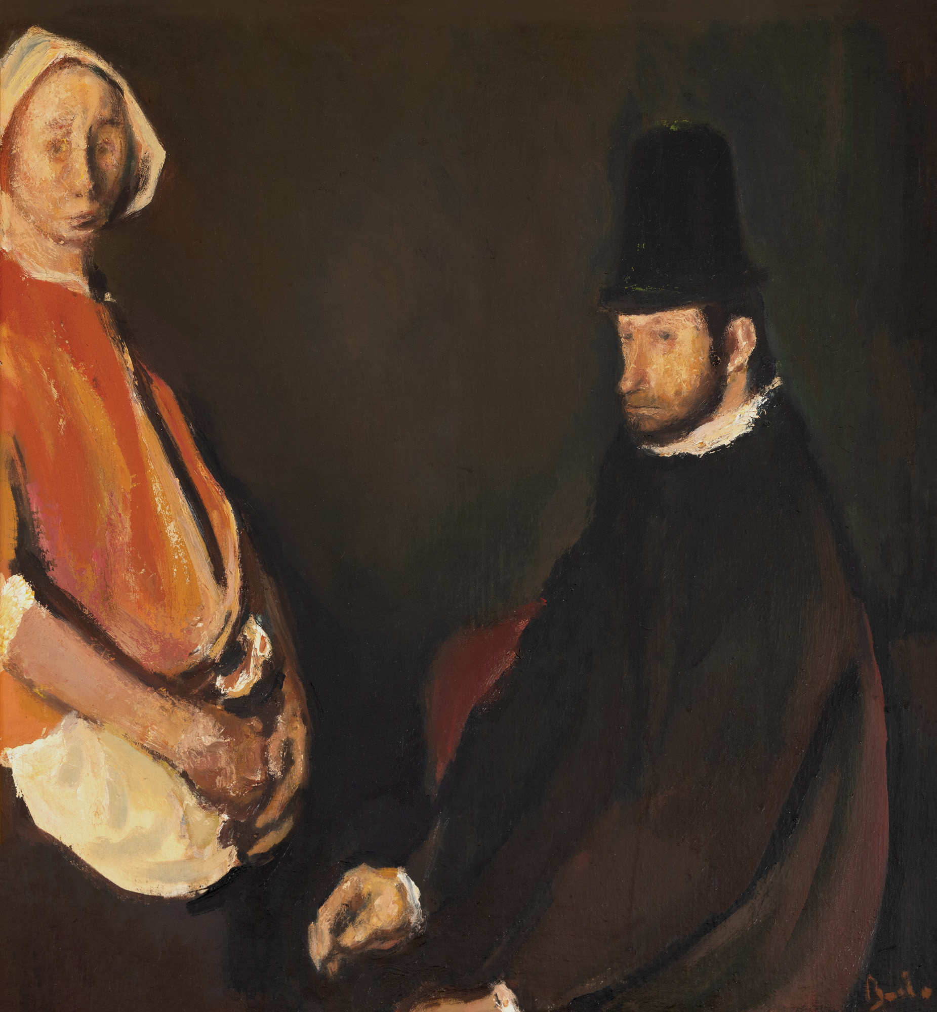 Arta lui Corneliu Baba este centrată pe observarea și realizarea oamenilor, este ritmată de nenumărate motive și teme, unele reluate, altele devenite adevărate obsesii. De la dramatica temă a țăranilor până la obsesiile spaimei sau regilor nebuni împreună cu arlechinul, dar și alte teme predilecte ale acestuia includ peisajele venețiene unde reușește să surprindă imaginea melancolică, însă vie a arhitecturii palatelor și clădirilor din Veneția. Pe lângă acestea, o altă temă recurentă este cea a țăranilor și a activităților lor, unde a încercat să abordeze țăranii, în diferite ipostaze, deoarece pentru Baba subiectele cu țărani au un rol important, este legătura ancestrală între om și pământul pe care îl călcă. Legătura cu pământul le-a dat asprime și înțelepciune, aceștia nu sunt veseli, nici triști, sunt gravi și demni, nu au gesturi și nici grimase, iar câteva exemple în acest sens sunt: ”Veneția”, ”Pământ”, ”Peisaj venețian”, ”Arlechin 1978” și ”Frică 1978”. Arlechinii lui Baba nu sunt acrobați și joviali. Baba păstrează atributele ”vesele” recognoscibile ale ”Arlechinului” - tricornul obligatoriu și costumul în carouri viu colorate. În artă, tema ”Regelui nebun” este aceea a singurătății puterii, a solitudinii, a alinării și dezamăgirilor pe care le aduce acesta. De obicei, în cazul lucrărilor lui Corneliu Baba, tema este legată de Shakespeare și Regele Lear, iar un exemplu în acest sens este: ”Regele nebun 1981” . În ceea ce privește lucrarea de față, care poate fi încadrată în perioada anilor 1980, când artistul începe să realizeze astfel de lucrări, în care centrul de interes este asupra cuplului, și aici se poate observa aceeași ideea a conturării și reprezentării scenei în câteva culori, unde negrul predomină întreaga compoziție. Lucrarea se concentrează pe surprinderea celor două personaje, a cuplului. În stânga compoziției se află femeia ce poartă o bluză roșie cu o fustă brun închis și basma albă pe cap și care stă cu mâinile împreunate, în picioare și se uită către privitor. În stânga, așezat pe un scaun roșu, se află bărbatul care este îmbrăcat elegant, într-un costum negru, cu barbă și mustață și care privește către stânga compoziției. De asemenea, câteva exemple în acest sens sunt: ”Scenă de gen (1987), ”Cina”, ”Dublu portret” sau ”La masă”. Lucrarea pare să aibă accente și elemente din stilul pictorului Rembrandt deoarece Baba a fost atras de către lucrările acestuia și a încercat pe cât posibil să transpună în cadrul lucrărilor sale din stilul de creație a lui Rembrandt. Aceasta artă a jocului de lumini sau de clarobscur inspirată de la Rembrandt este preponderentă și se poate observa și în cazul lucrării de față, dar și în cadrul altor tablouri care prezintă portretele altor personalități cum ar fi: ”Lucia Sturdza-Bulandra”, ”George Enescu” sau ”Tudor Arghezi.” În cadrul portretelor sale, o altă caracteristică a lui Baba este atenția deosebită acordată mâinilor, ca element cheie în caracterizarea personalității umane, exact ca Rembrandt și marii portretiști din școala olandeză, deoarece Baba își pregătea portretele, pe urmele maestrului său Rembrandt, printr-un număr uriaș de schițe ale mâinilor sau ochilor dorind să surprindă cât mai bine stilul de realizare al acestuia.