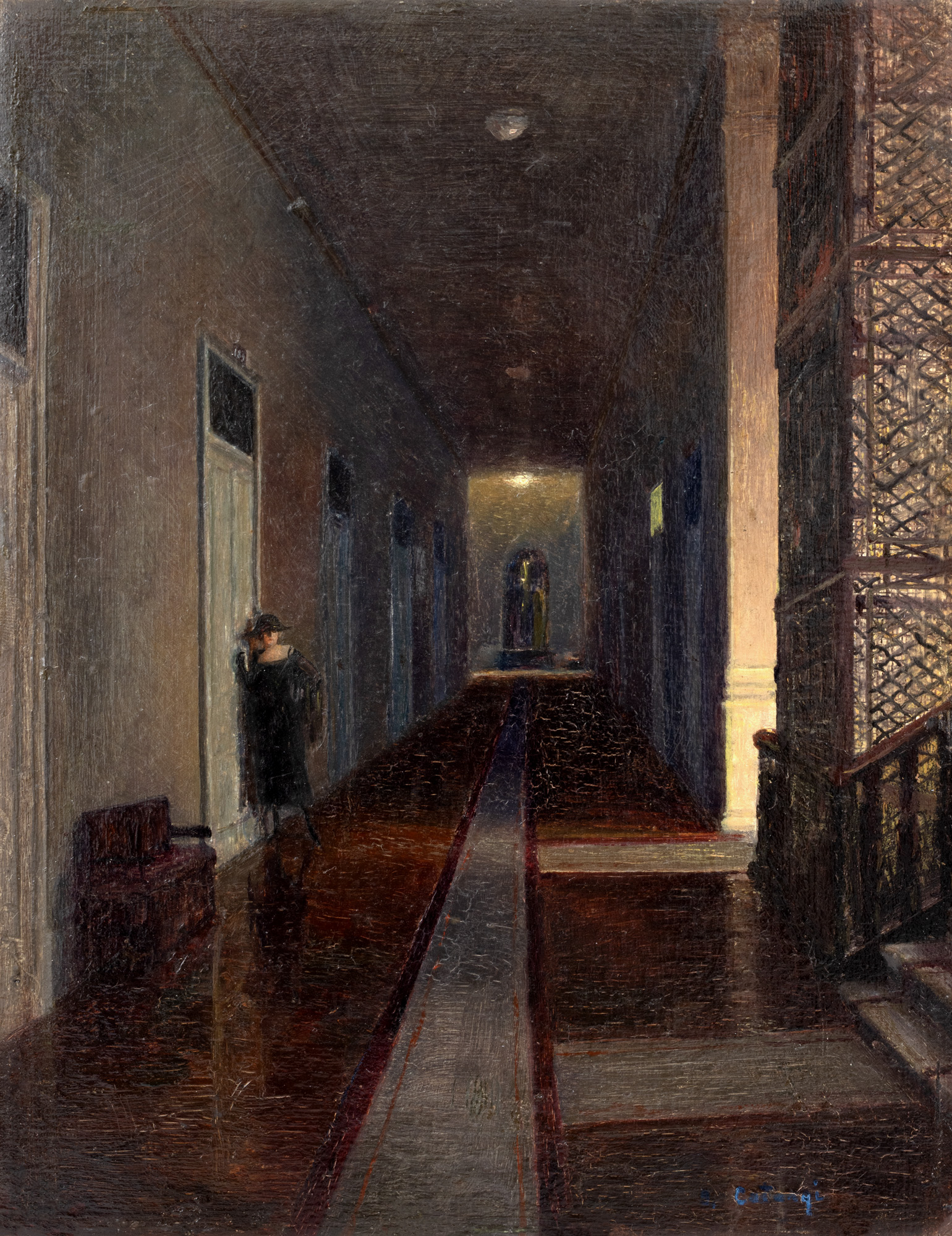 Etichetă de participare la Salonul Oficial,1925, cu titlul, "Pe culoar, noaptea".