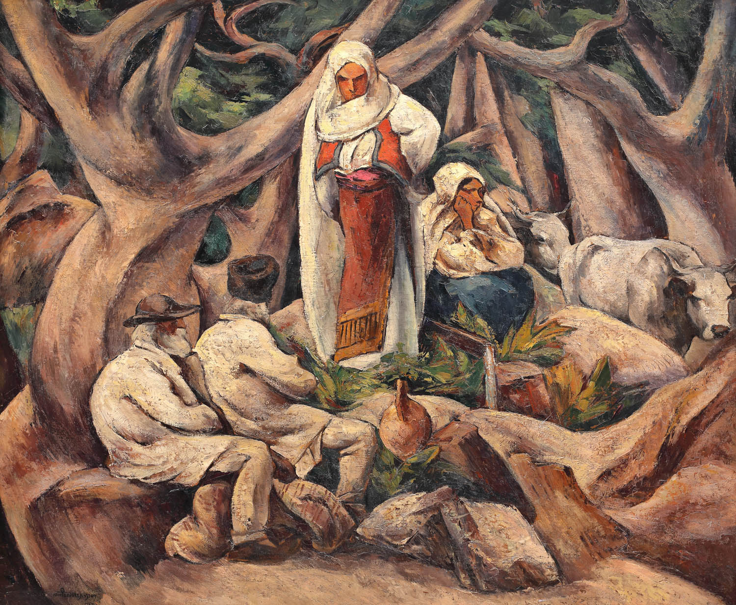 Perioada cea mai prolifică şi totodată mai valoroasă din opera lui Ion Theodorescu-Sion o reprezintă fără îndoială aceea în care artistul a devenit preocupat de ideile naţionale ale tradiţionalismului. În noul context geopolitic şi social, acela al României Mari, nevoia căutărilor naţionaliste devine indispensabilă, iar Sion răspunde prompt noii ordini după război. Se prezintă cuminţit, clasicizant în formă şi puternic naţionalist în conţinut. Lucrări epice, ilustrând scene din viaţa țăranului, rescriu în interbelic utopia paşoptistă, nuanţând-o corespunzător spiritului vremii. Seria de tablouri cu subiect românesc, pe care le putem integra ciclului “compoziții cu motive românești", formează o etapă revelatoare deopotrivă tematic şi stilistic. Adânc preocupat de pictura murală, artistul adaugă compoziţiei un plus de monumentalitate prin înţelegerea spaţiului şi dezvoltarea armonioasă a formelor, aplatizarea decorativă, precum şi tratarea murală a materiei picturale. Vocaţia de monumentalist o va vedea împlinită abia spre sfârşitul vieţii, în 1935, când execută patru picturi maruflate pentru Palatul Regal, actualul sediu al Muzeului Naţional de Artă al României, iar doi ani mai târziu va transpune în tempera panourile decorative pentru expoziţiile internaţionale de la Paris (1937) şi New York (1939). Pictura lui Theodorescu-Sion din deceniul trei al secolului trecut reprezintă unul dintre factorii cei mai reprezentativi ai artei românești moderne. În cazul particular al pictorului, putem identifica principalele mutații stilistice ce se produc după Primul Război Mondial, moment ce generează o fervoare în identitatea națională, ce se resimte în întregul tablou cultural. Premisele pe care Sion le remodelează și accentuează în acest context sunt cele ce definesc totodată creația din perioada 1924-1927, etapă ce încadrează și opera de față. Artistul va reuși să esențializeze unele componente ale peisajului, pe care le va folosi în special pentru caracterul simbolic-generalizant. Alt factor de concretețe este conturat în jurul prezenței umane, care devine o constantă. Vizualul nu mai rămâne blocat în considerații de calitate, ci devine sursă de valoare. Omul, în cazul imaginilor lui Sion, apare nu doar ca purtător de individualitate psihologică, ci se sintetizează drept arhetip, în cazul nostru, al tradiției. În “La șipot” descoperim întocmai aceste coordonate stilistice, în fapt fiind punctul de plecare în seria ce va defini micro-etapa amintită mai sus. Intenţia de observare a realităţii este evidentă, însă este imposibil de ascuns idealizarea specifică tradiţionalismului interbelic, care conferă un aer teatral/scenografic compoziţiilor. Dispunerea piramidală a personajelor înscrise peisajului rezolvat prin geometrizări aproape cubiste relevă expresivitatea raţională a schemei, dar și marcarea arhetipală a fiecărui motiv în parte: peisajul apare germinativ, dar indescifrabil, iar țăranii, plini de putere și monumentali, păstoresc întreaga compoziție dominată de supratipul țărăncii.