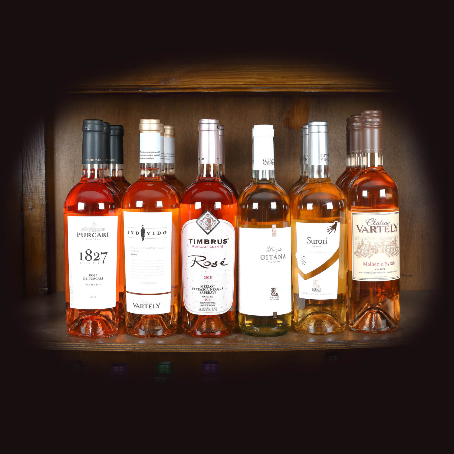 Roz de Gitana, Merlot, 2018, sec, 3st x 0,75l Gitana, Surori Rose 2018, (Saperavi, Rară Neagră), sec, 3st x 0,75l Purcari Timbrus Rose (Merlot, Fetească Neagră, Saperavi), 2018, sec, 3st x 0,75l Rose de Purcari 2019, sec, 3st x 0,75l Vartely Individo Merlot & Cabernet Sauvignon Rose 2018, sec, 3st x 0,75l Vartely Malbec Syrah Rose, 2018, demisec, 3st x 0,75l