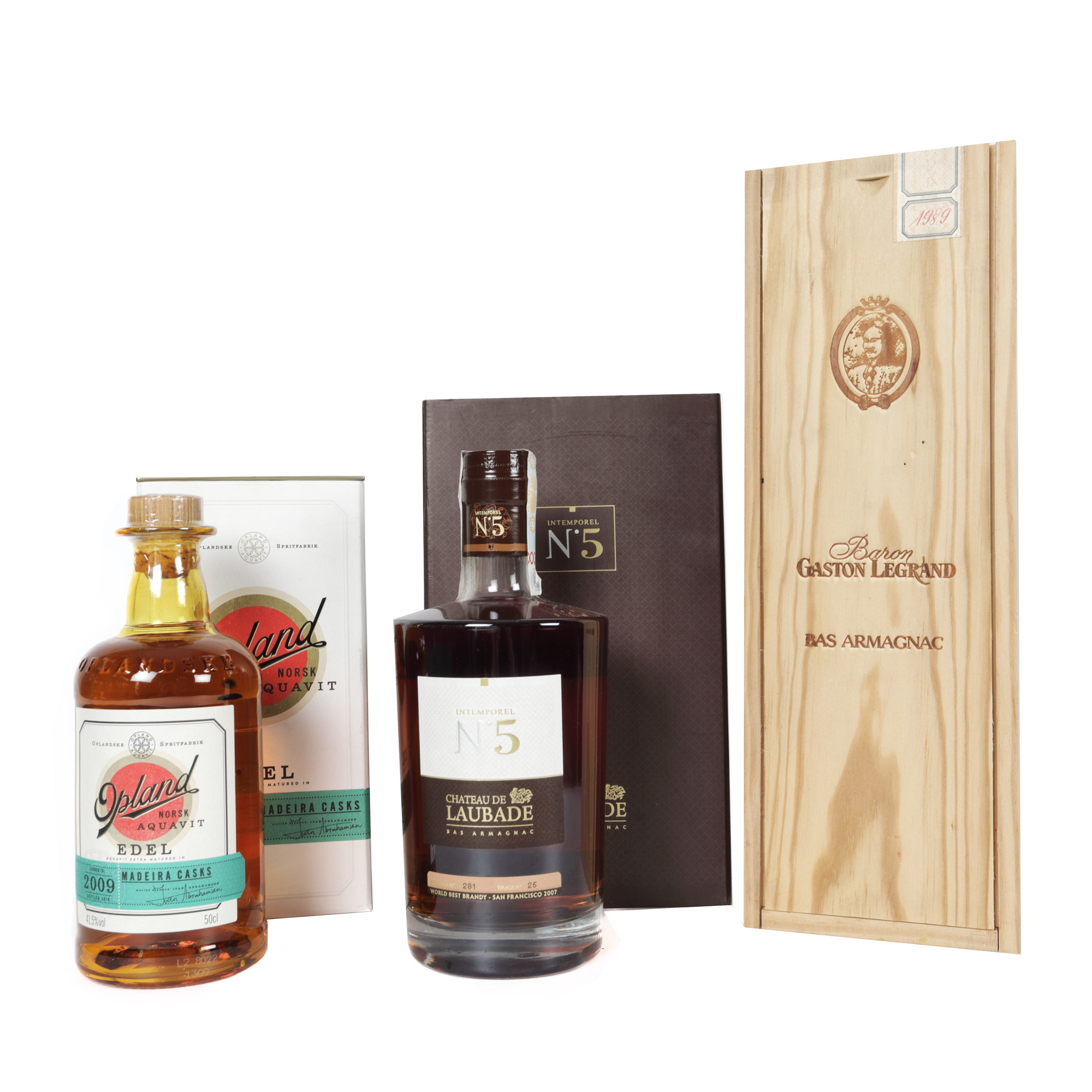 64. Baron Gaston Legrand, Bas Armagnac, Château de Laubade, Intemporel, No. 5, Bas Armagnac, Edel Opland, Norsk Aquavit, 2st x 0,70l, 1st x 0,50l