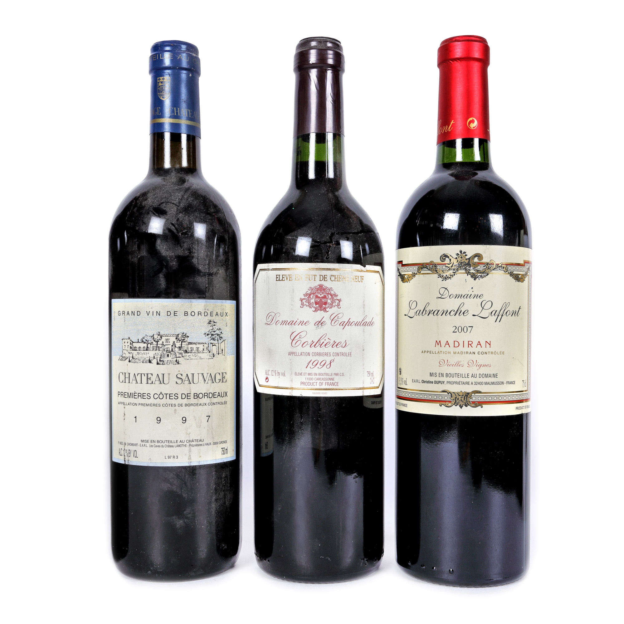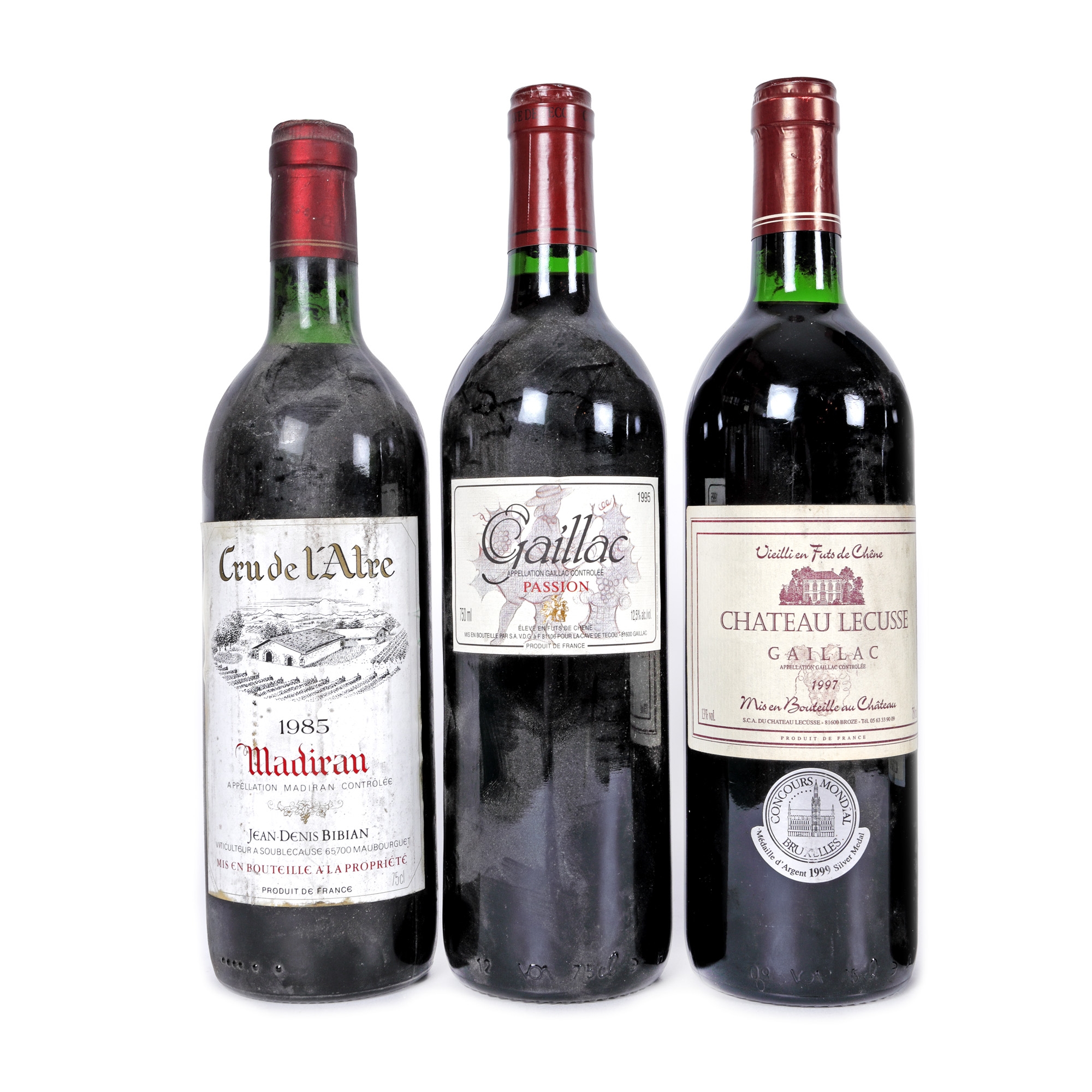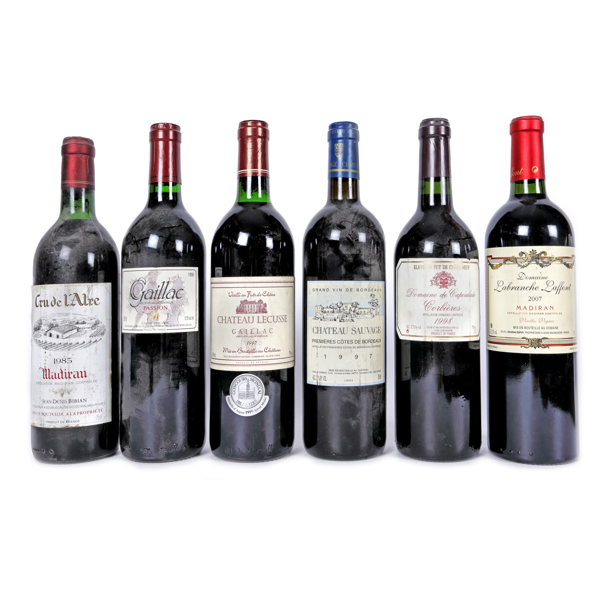 171. Château Lacusse, Gaillac, 1997, Château Sauvage, Premieres Cotes de Bordeaux, 1997, Domaine Labranche Laffont, Madiran, 2007, Cru de'lAtre, Madiran, 1985, Passion, Gaillac, 1995, Domaine de Capoulade, Corbieres, 1998, 6st x 0,75l