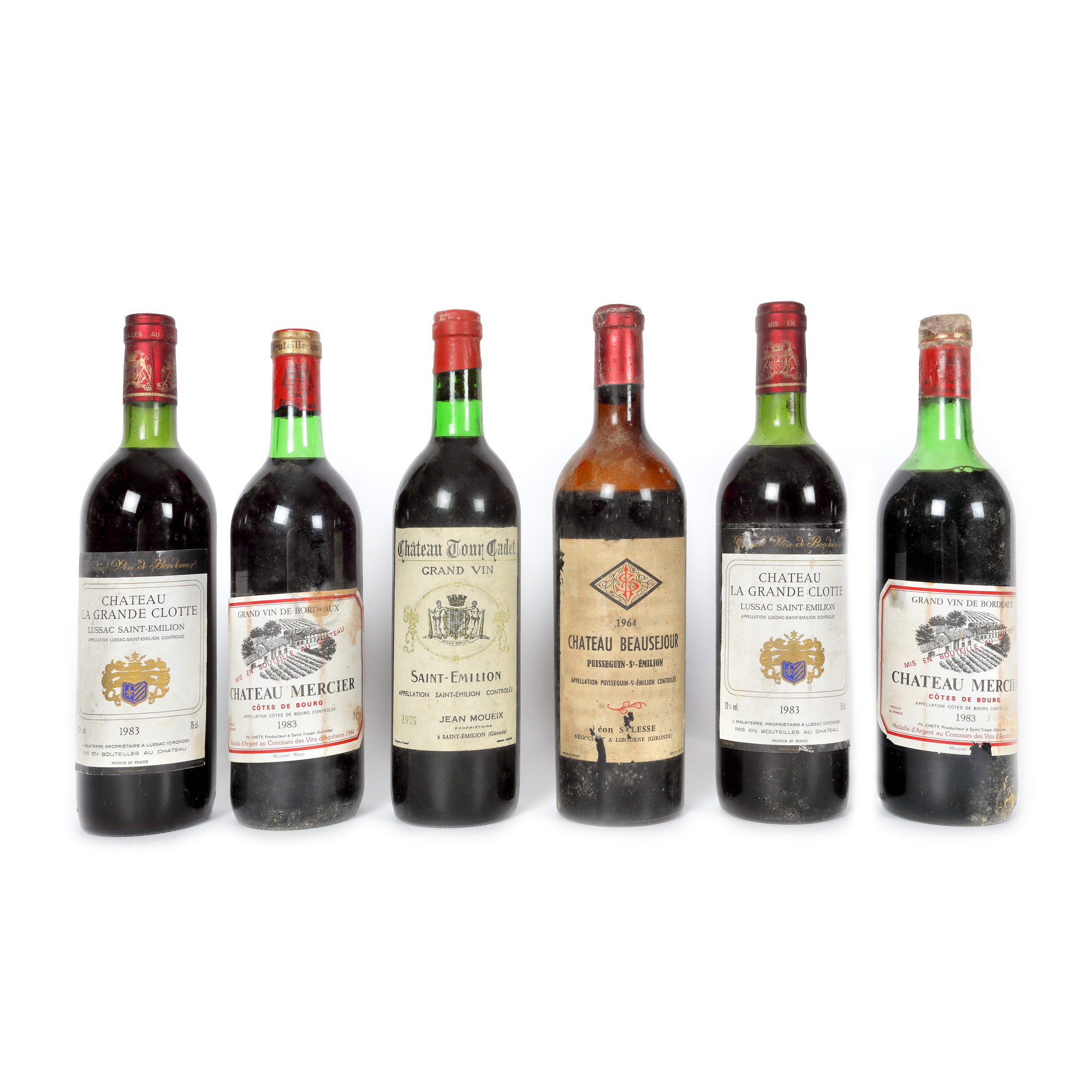 172. Château Mercier, Côtes de Bourg, 1983, Château La Grande Clotte, Lussac Saint-Émilion, 1983, Château Tour Cadet, Saint-Émilion, 1975, Château Beausejour, Puisseguin-Saint-Émilion, 1964, 2st x 0,75l, 2st x 0,75l, 2st x 0,75l