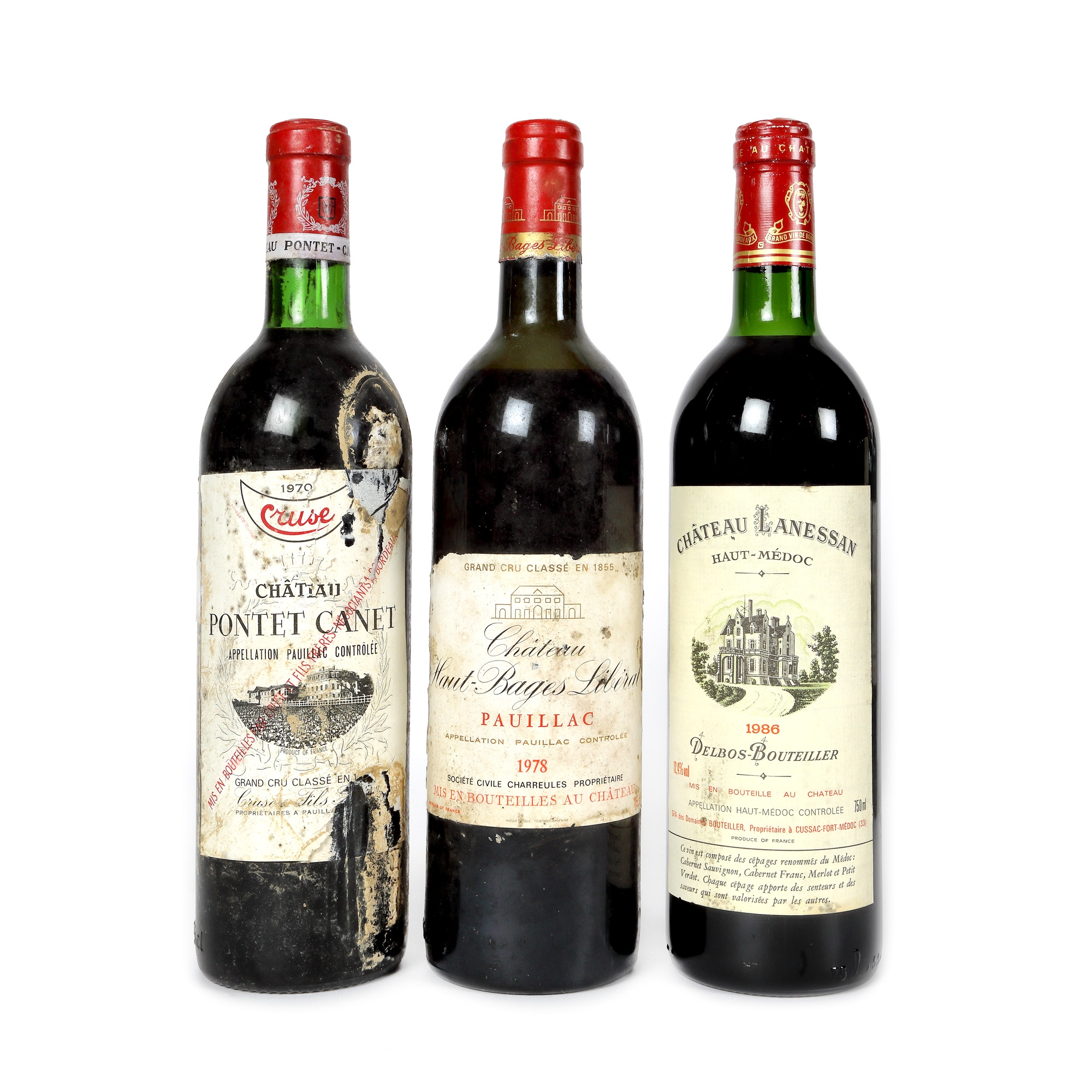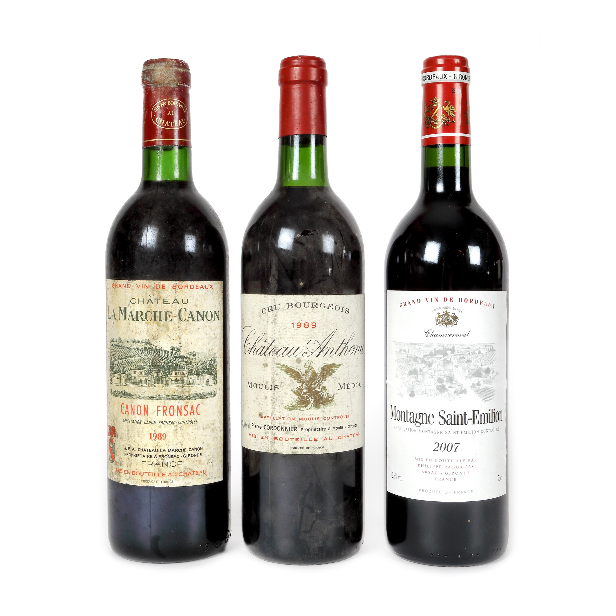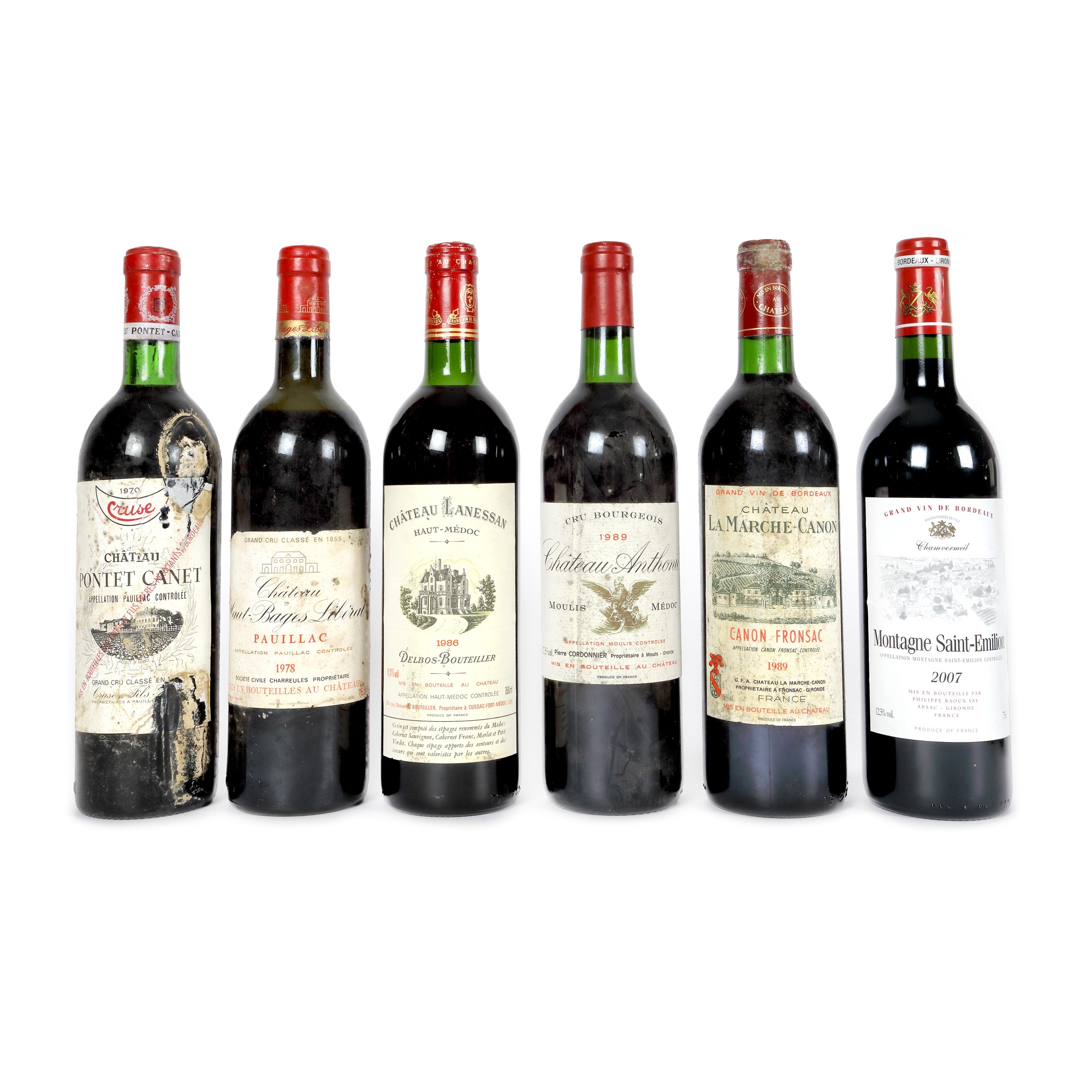 Château La Marche-Canon, Canon Fronsac, 1989, 1st x 0,75l Château Anthonic, Moulis-en-Médoc, 1989, 1st x 0,75l Château Haut-Bages Liberal, Pauillac, 1978, 1st x 0,75l Chamvermeil, Montagne, Saint-Émilion, 2007, 1st x 0,75l Château Lanessan, Haut-Médoc, 1986, 1st x 0,75l Château Pontet Canet, Pauillac, 1970, 1st x 0,75l
