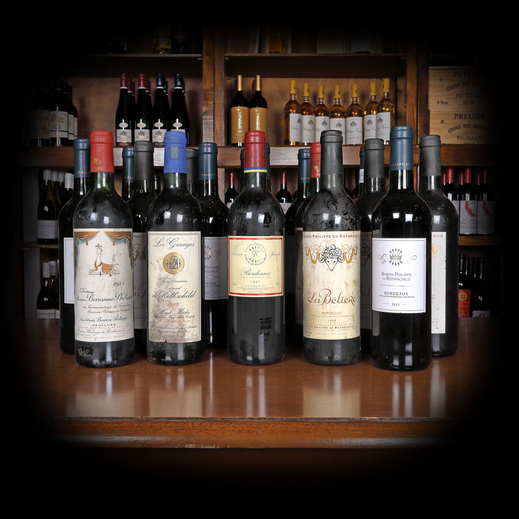 Baron Philippe de Rotschild, La Beliere, Bordeaux, 1998, 7st x 0,75l Baron Philippe de Rotschild, Bordeaux, 2015, 6st x 0,75l Chateau Baron Philippe de Rotschild, Pauillac Grand Cru Classe, 1985, 2st x 0,75l Lafite Reserve Speciale, Barons de Rothschild, 1997, 1st x 0,75l Les Granges de Domaine Edmond, Edmond de Rotschild, Haut Medoc, 1998, 1st x 0,75l