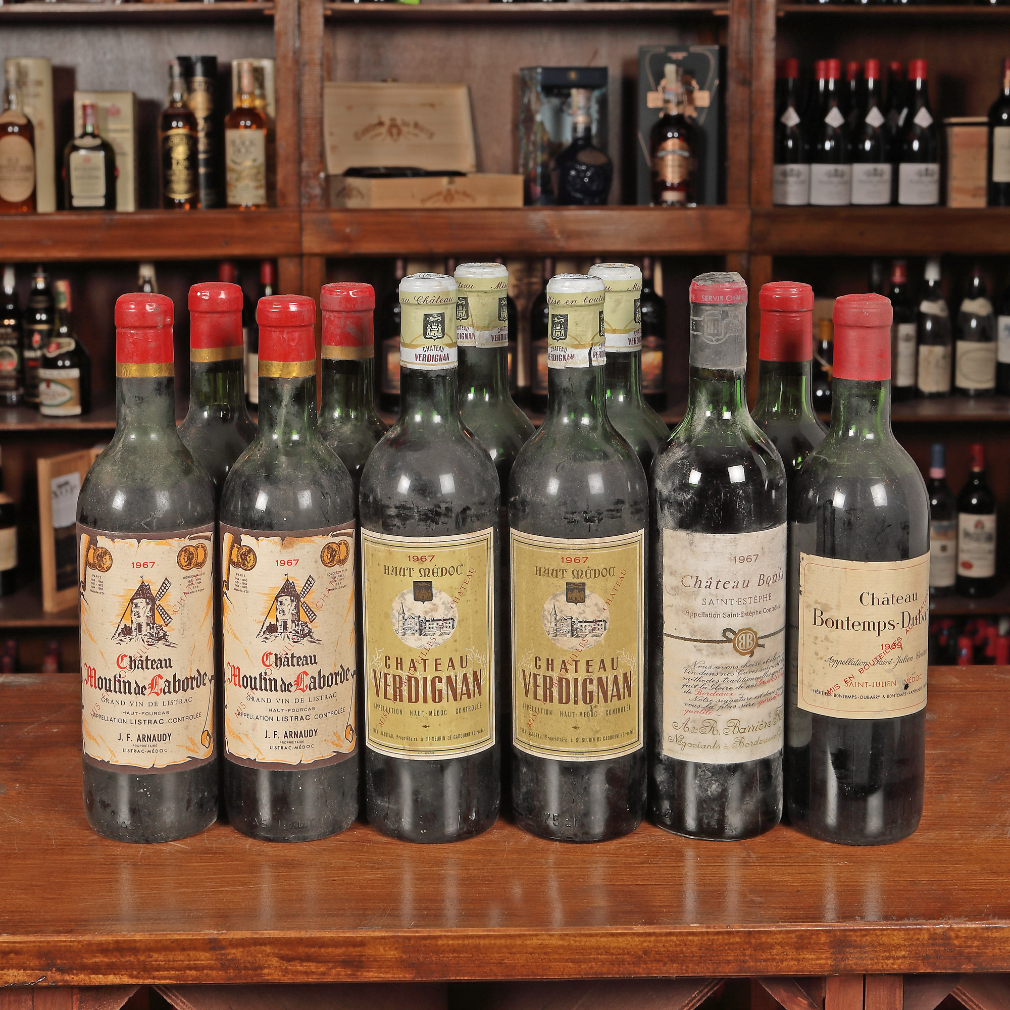 Château Moulin de Laborde, Listrac AOC, 1967, 4st x 0,75l Château Verdignan, Haut-Médoc AOC, 1967, 4st x 0,75l Château Bonis, Saint-Estèphe, 1967, 1st x 0,75l Château Bontemps-Dubarry, Saint-Julien AOC, 1969, 2st x 0,75 Având în vedere vârsta înaintată a sticlelor, nivelul de lichid în sticlă, etichetele și capișoanele pot avea semne de evaporare și/sau uzură.