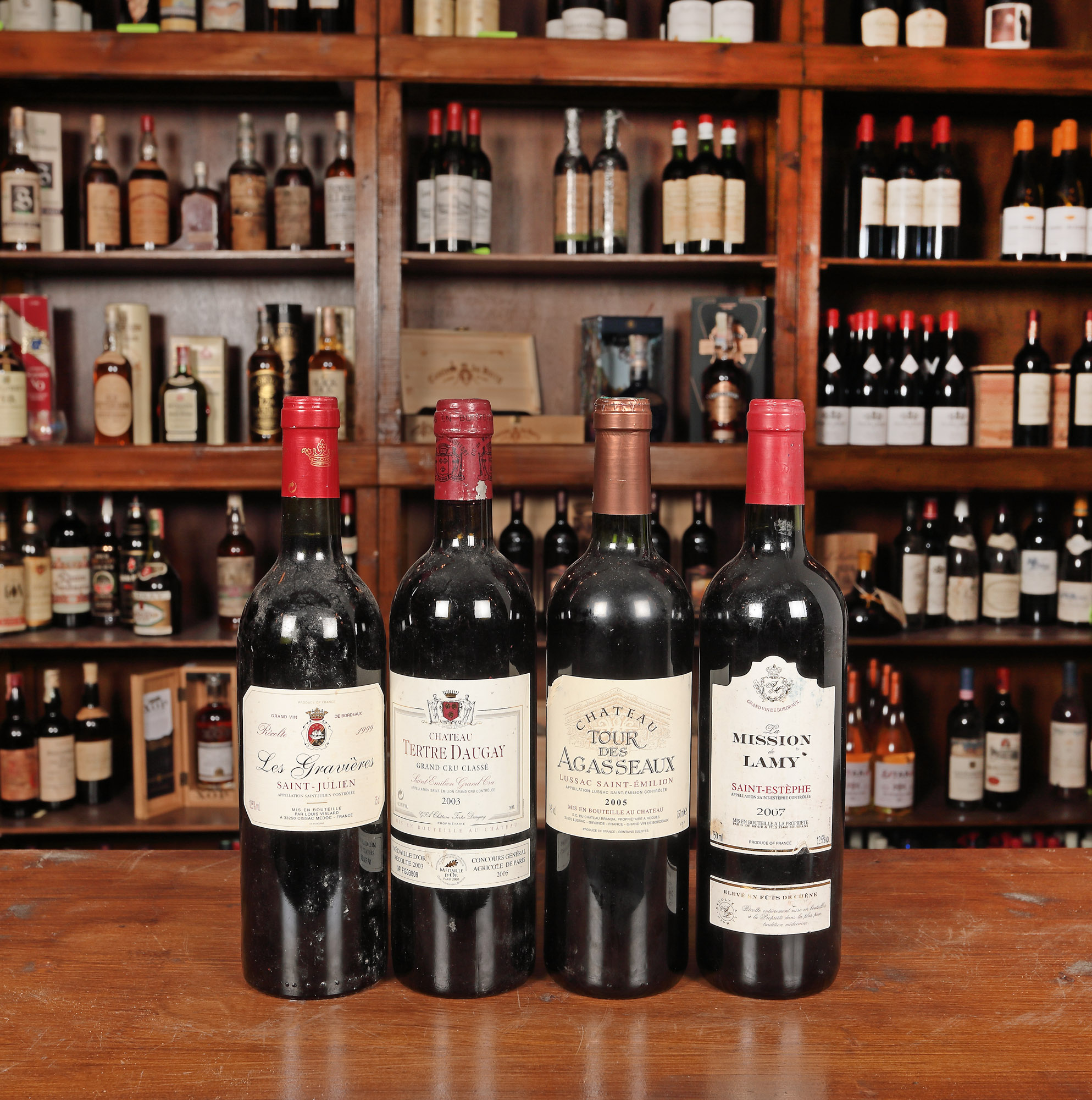 Les Gravieres, Saint-Julien AOC, 1999, 1st x 0,75l Château Tertre Daugay, Saint-Émilion Grand Cru Classé, 2003, 1st x 0,75l Château Tour des Agasseaux, Lussac Saint-Émilion AOC, 2005, 1st x 0,75l La Mission de Lamy, Saint-Estèphe AOC, 2007, 1st x 0,75l Având în vedere vârsta înaintată a sticlelor, nivelul de lichid în sticlă, etichetele și capișoanele pot avea semne de evaporare și/sau uzură.