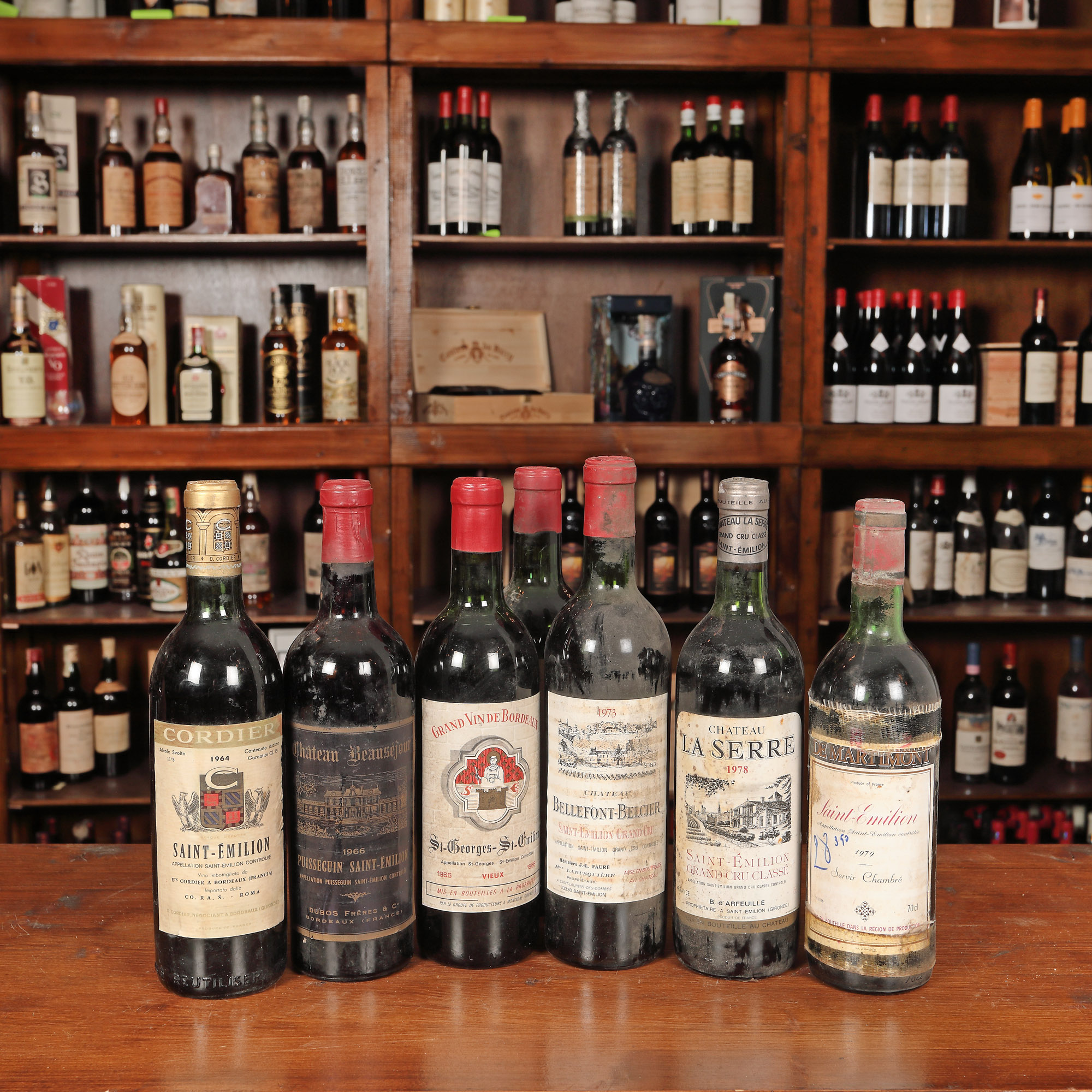 Cordier, Saint- Émilion AOC, 1964, 1st x 0,75l Chateau Beausejour, Saint- Émilion AOC, 1966, 1st x 0,75l St. Georges-St.Emilion, Saint- Émilion AOC, 1966, 2st x 0,75l Chateau Bellefont-Belcier, Saint- Émilion Grand Cru, 1973, 1st x 0,75l Chateau La Serre, Saint- Émilion Grand Cru Classé, 1978, 1st x 0,75l Martimont, Saint- Émilion AOC, 1979, 1st x 0,75l Având în vedere vârsta înaintată a sticlelor, nivelul de lichid în sticlă, etichetele și capișoanele pot avea semne de evaporare și/sau uzură.