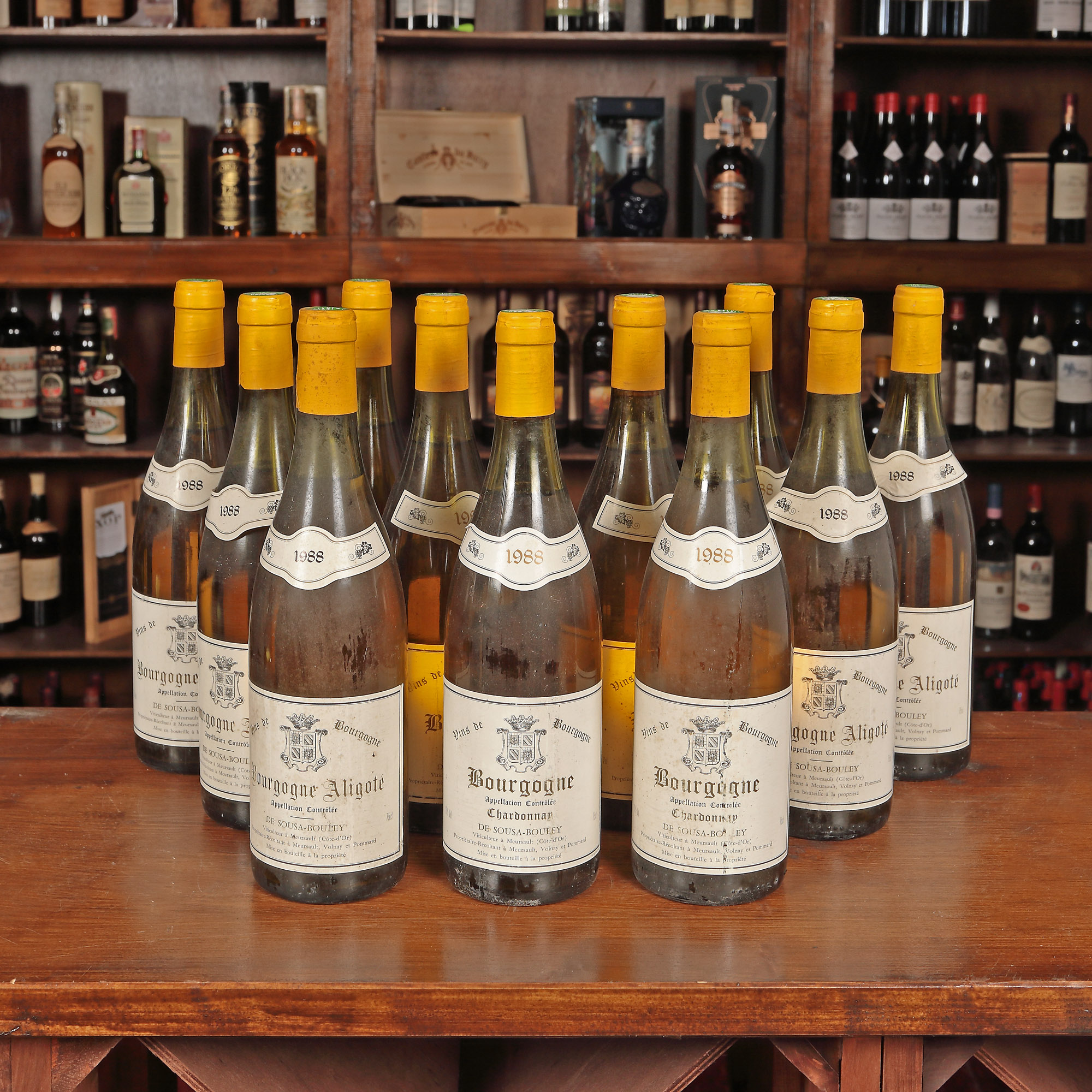 Bourgogne, De Sousa-Bouley, Franta, Chardonnay, 1988, 5st x 0,75l Bourgogne, De Sousa-Bouley, Franta, Aligote, 1988, 6st x 0,75l Având în vedere vârsta înaintată a sticlelor, nivelul de lichid în sticlă, etichetele și capișoanele pot avea semne de evaporare și/sau uzură.