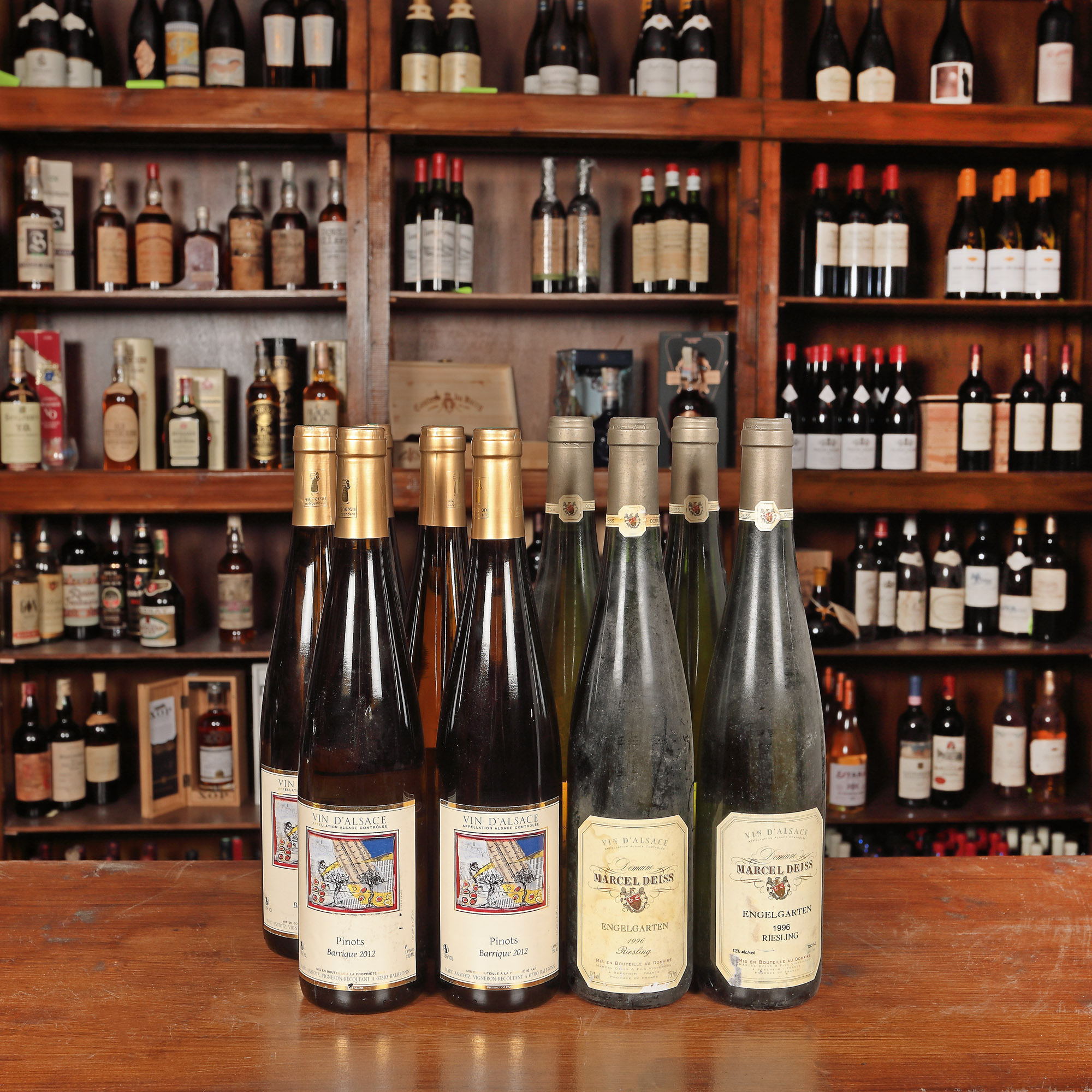 Vin d'Alsace, Pinots Barrique 2012, 5st x 0,75l Vin d'Alsace, Marcel Deiss Riesling, 1996, 4st x 0,75l Având în vedere vârsta înaintată a sticlelor, nivelul de lichid în sticlă, etichetele și capișoanele pot avea semne de evaporare și/sau uzură.
