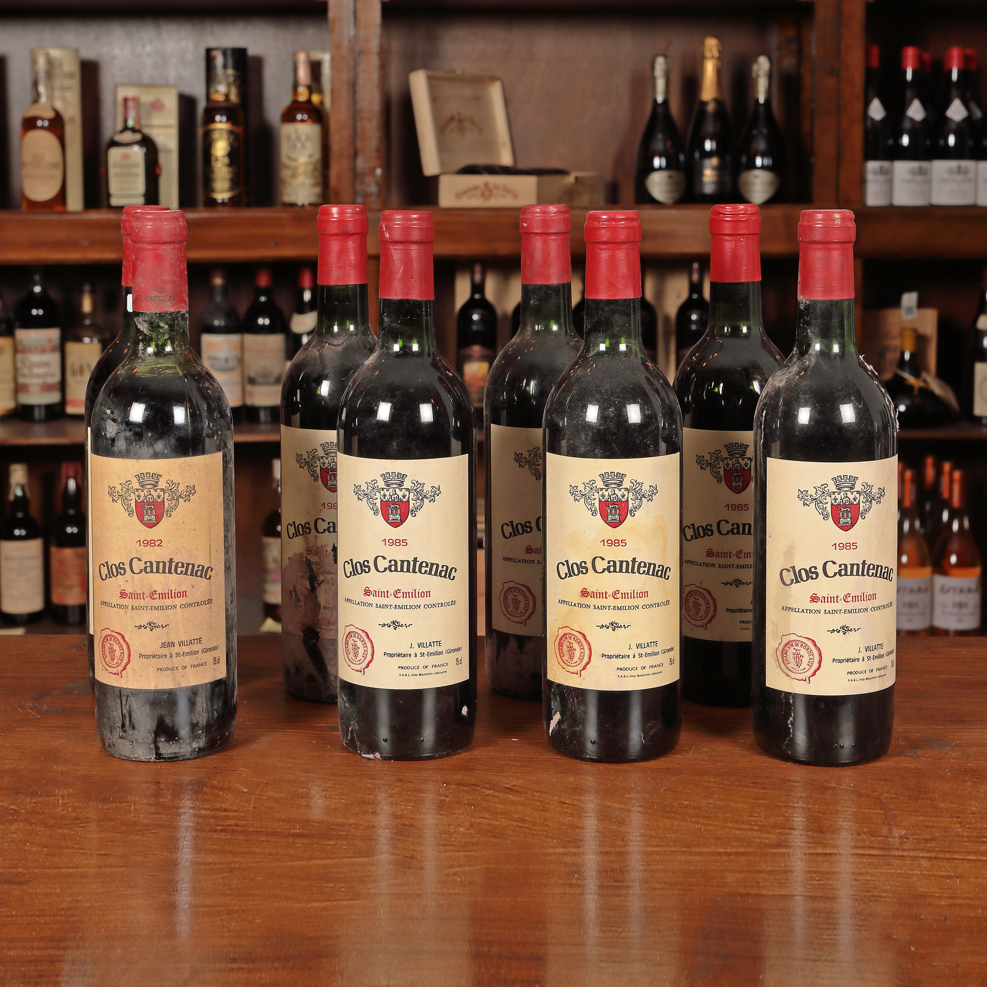 Clos Cantenac, Saint-Émilion AOC, 1982, 1st x 0,75l Clos Cantenac, Saint-Émilion AOC, 1985, 7st x 0,75l Având în vedere vârsta înaintată a sticlelor, nivelul de lichid în sticlă, etichetele și capișoanele pot avea semne de evaporare și/sau uzură.