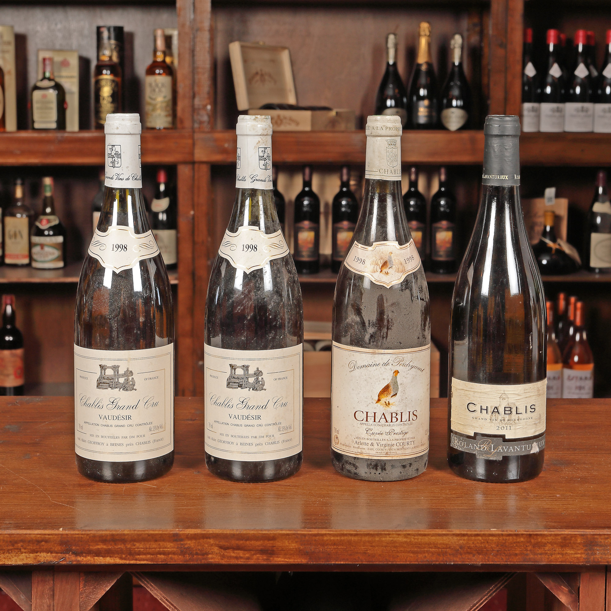 Domaine de Perdrycourt, Chablis Cuvée Prestige, 1998, 1st x 0,75l Vaudésir, Chablis Grand Cru, 1998, 2st x 0,75l Roland Lavanturieux, Chablis Grand Vin de Bourgogne, 2011, 1st x 0,75l Având în vedere vârsta înaintată a sticlelor, nivelul de lichid în sticlă, etichetele și capișoanele pot avea semne de evaporare și/sau uzură.