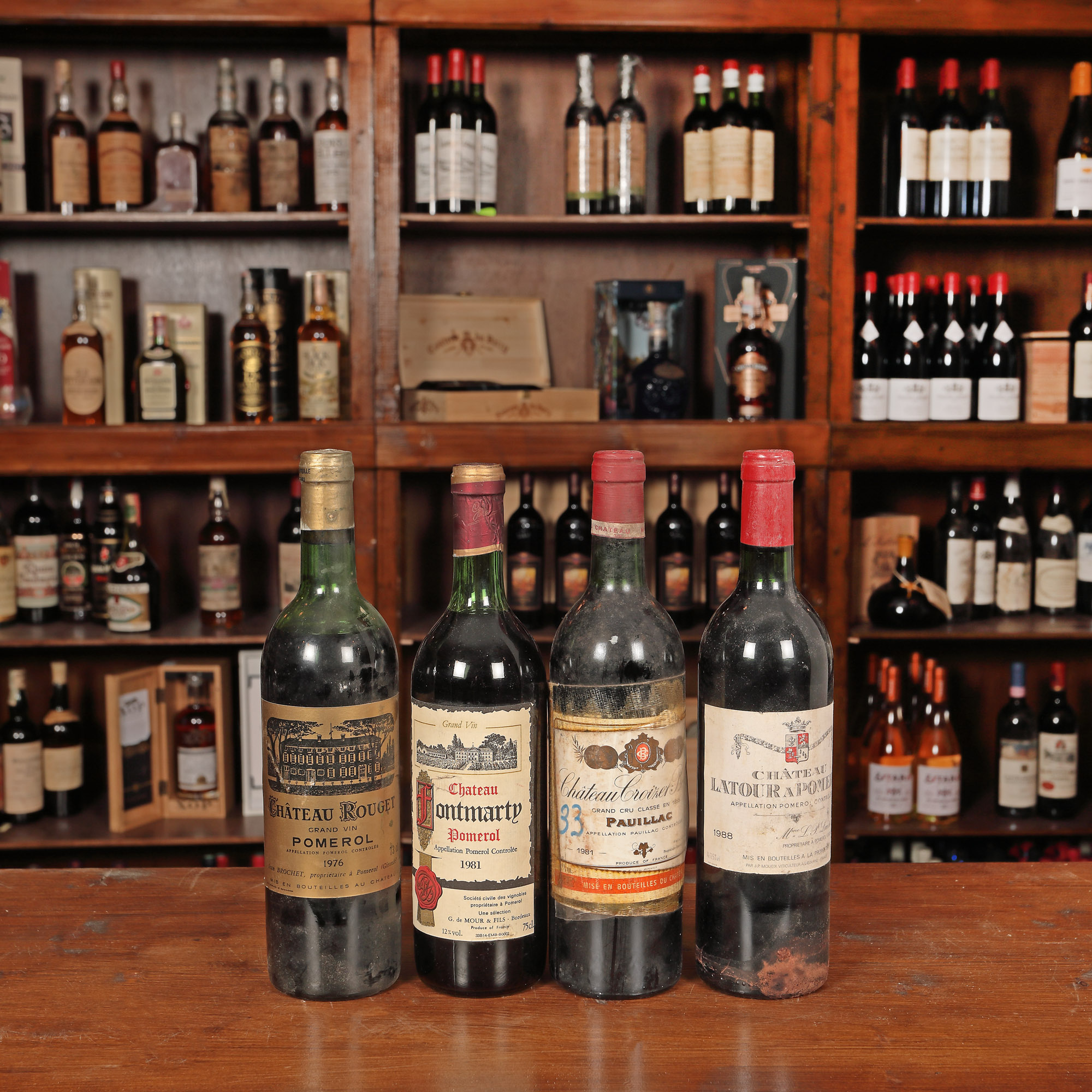 Château Rouget, Pomerol AOC, 1976, 1st x 0,75l Château Fontmarty, Pomerol AOC, 1981, 1st x 0,75l Château Croizet Bages, Pauillac AOC, 1981, 1st x 0,75l Château Latour à Pomerol, Pomerol, 1988, 1st x 0,75l Având în vedere vârsta înaintată a sticlelor, nivelul de lichid în sticlă, etichetele și capișoanele pot avea semne de evaporare și/sau uzură.