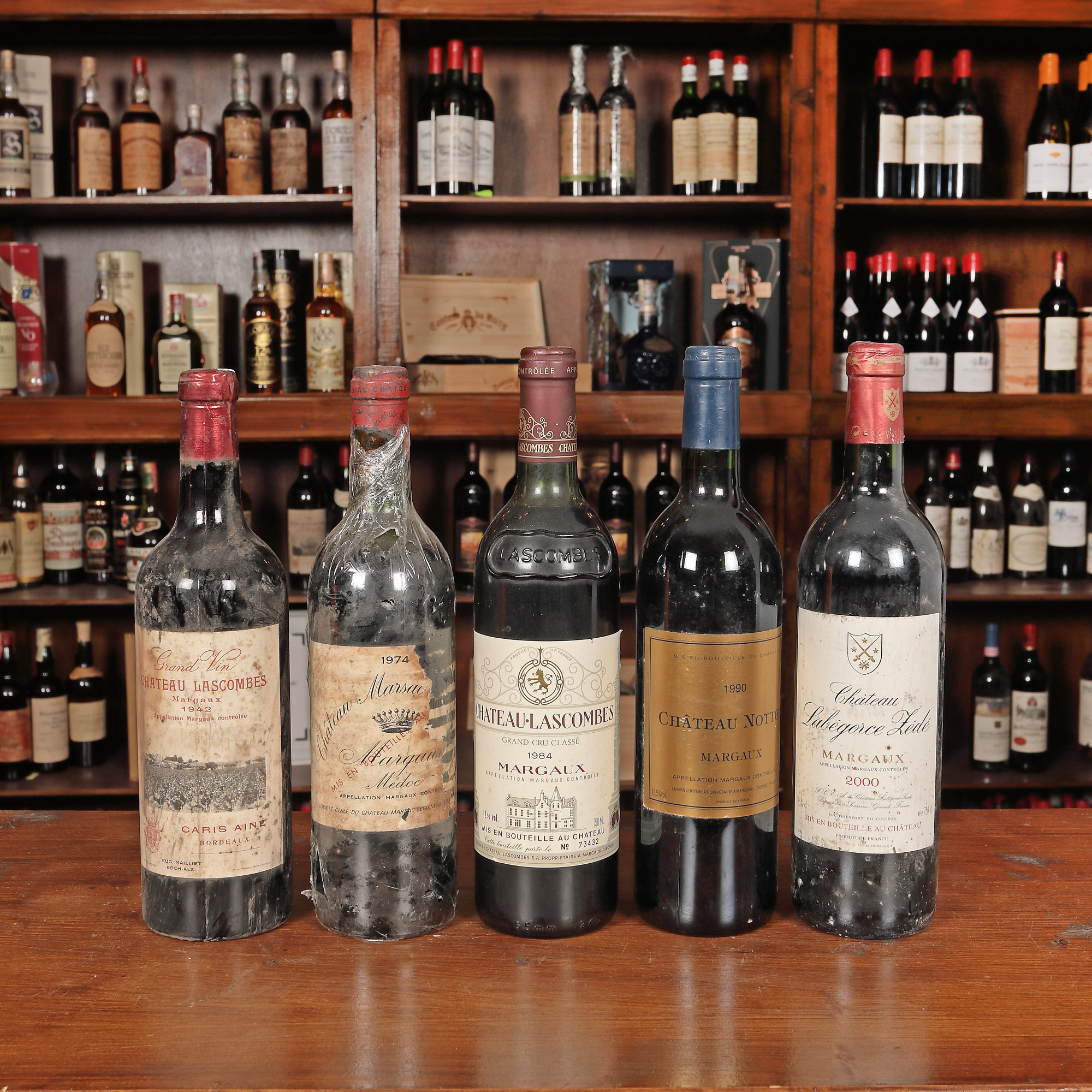 Château Lascombes, Margaux AOC, 1942, 1st x 0,73l Château Marsac Seguineau, Margaux AOC, 1974, 1st x 0,73l Château Lascombes, Grand Cru Classé, Margaux AOC, 1984, 1st x 0,75l Château Notton, Margaux AOC, 1990, st x 0,75l Château Labergoce Zedé, Margaux AOC, 2000, 1 st x 0,75l Având în vedere vârsta înaintată a sticlelor, nivelul de lichid în sticlă, etichetele și capișoanele pot avea semne de evaporare și/sau uzură.