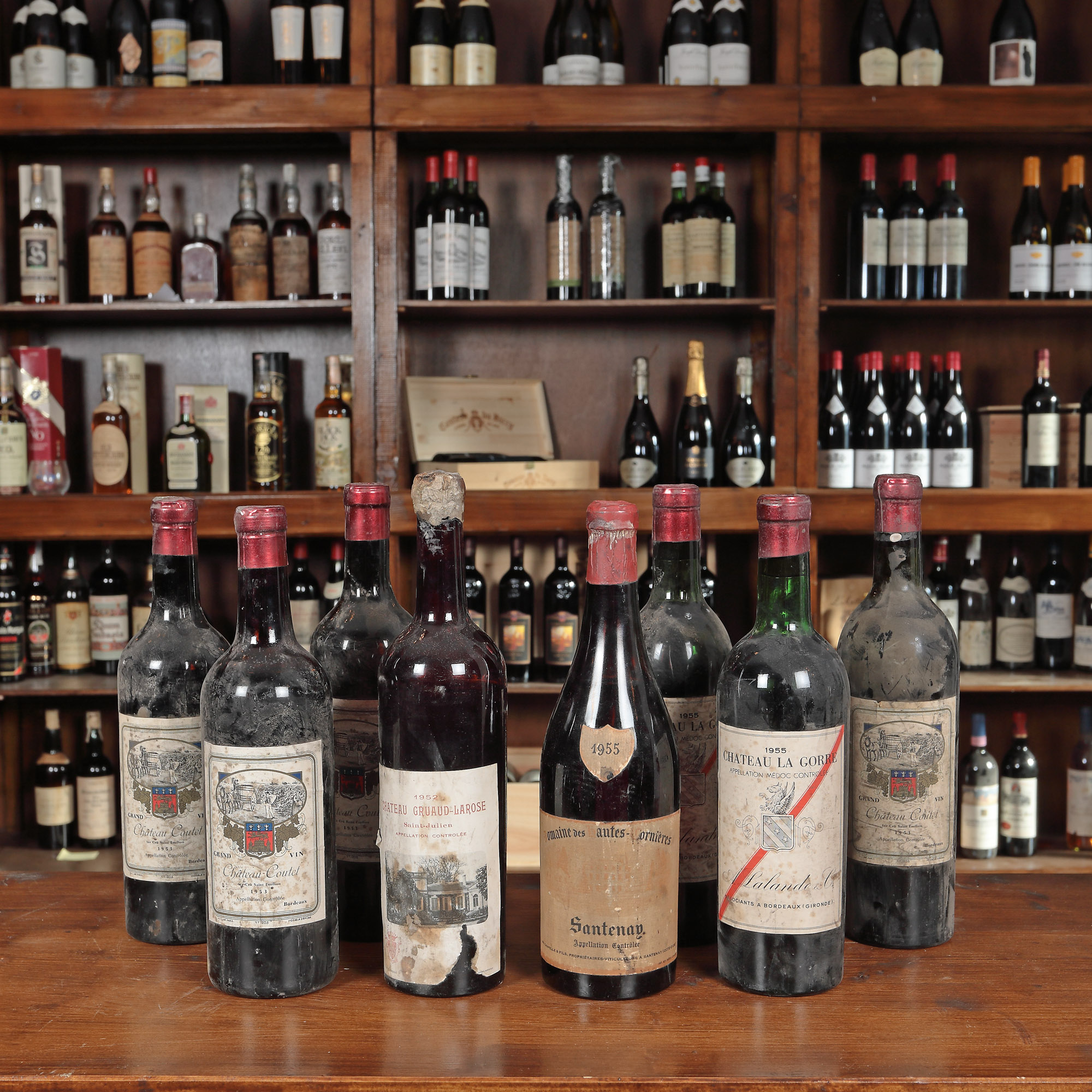 Château Gruaud-Larose, Saint-Julien AOC, 1952, 1st x 0,75l Château Coutet, Saint-Émilion Cru, 1953, 4st x 0,75l Domaine des Hautes Cornières 1985, Santenag AOC, 1955, 1st x 0,75l Château La Gorre, Médoc AOC, 1955, 2st x 0,75 Având în vedere vârsta înaintată a sticlelor, nivelul de lichid în sticlă, etichetele și capișoanele pot avea semne de evaporare și/sau uzură.
