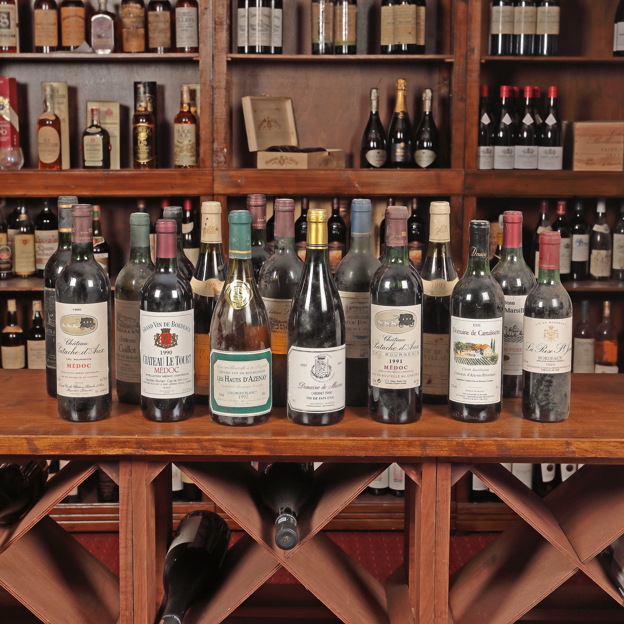 Jean Claude Boisset, Côte de Nuits Villages, 1993, 2st x 0,75l Château Gaillot, Côtes de Duras, 1993, 1st x 0,75l Château Liouner Listrac-Médoc, 1990, 1st x 0,75l Château La Sauvetat, Bordeaux, 1993, 1st x 0,75l Château Patache d'Aux, Cru Bourgeois, Médoc AOC, 1990, 2st x 0,75l Château Fons de Sergay, Bordeaux, 1993, 1st x 0,75l Domaine de Camaïssette, Côteaux d'Aix-en-Provence, 1991, 2st x 0,75l Les Hauts d'Azenay, Bourgogne AOC, 1992, 1st x 0,75l Château La Tour, Médoc AOC, 1990, 2st x 0,75l Château La Grave Marsillon, Bordeaux, 1st x 0,75l Château Patache d'Aux, Cru Bourgeois, Médoc AOC, 1991, 1st x 0,75l Domaine de Mairan, Cabernet Franc, 1993, 1st x 0,75l La Rose St. Jean, Bordeaux AOC, 1990, 1st x 0,5l Având în vedere vârsta înaintată a sticlelor, nivelul de lichid în sticlă, etichetele și capișoanele pot avea semne de evaporare și/sau uzură.