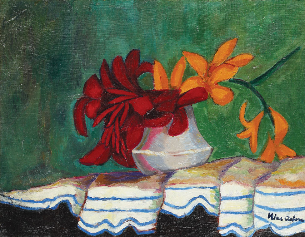 Nina Arbore provine dintr-o familie de intelectuali, descendenți dintr-un neam boieresc originar din Moldova. După terminarea studiilor liceale la București, timp în care a luat lecții de desen de la Nicolae Vermont, se înscrie la Academia din München, la clasa profesorului Angelo Jank (1868 - 1940). Decide să-și definitiveze studiile la Paris, unde a frecventat Academia liberă condusă de Matisse. Contactul cu faimoasa cage aux fauves a jucat un rol decisiv în orientarea ulterioară a artistei, cea mai mare parte a creației sale fiind tributară inovațiilor plastice aduse de Henri Matisse. După experiența pariziană, Nina Arbore revine în țară, unde și-a desfășurat activitatea până la sfârșitul vieții. Se împarte între lucrul de atelier, cariera didactică (predă doi ani la Academia de Artă Decorativă înființată de Maxy) și pictura bisericească (Sinaia și Constanța). Desfășoară o intensă activitate expozițională, fiind acceptată în cercurile cele mai selecte ale modernismului, spre exemplu numele artistei fiind regăsit în selecția expoziției „Contimporanul” din 1924. Participă la toate expozițiile grupului Femeilor pictore și sculptore, a cărui membră fondatoare a fost alături de Cecilia Cuțescu-Stork și Olga Greceanu. De asemenea participă constant la Saloanele Oficiale ale vremii și la alte expoziții de grup, de răsunet în epocă: Arta română, Arta nouă, Grupul nostru, Expoziția internațională de la Barcelona, Expoziția de artă futuristă de la Roma. Registrul tematic al artistei este restrâns, abordând cu predilecție compoziții cu portret, naturi statice și rareori peisaje (totdeauna urbane). Stilul abordat, în esență eclectic, se revendică de la fovism, expresionism, noua obiectivitate, noul clasicism, iar uneori recurge la stilizări decorative de tip post-bizantin. Lucrarea “Vas cu crini” face parte dintr-o serie tematică favorită a artistei, preocupată de o interpretare simbolică a motivelor picturale. Nina Arbore exploatează culorile, reușind prin dublul contrast puternic (roșu/verde și oranj/albastru) să obțină efectul nuanțat a ceea ce numea Louis Vauxcelles – “fiare sălbatice”. Este o compoziție solidă, rezolvată în linie clasicizantă, care reflectă perfect crezul artistei: „urăsc tot ce e vulgar și insistent. Caut măreție și seriozitate clasică.” (V.I.)