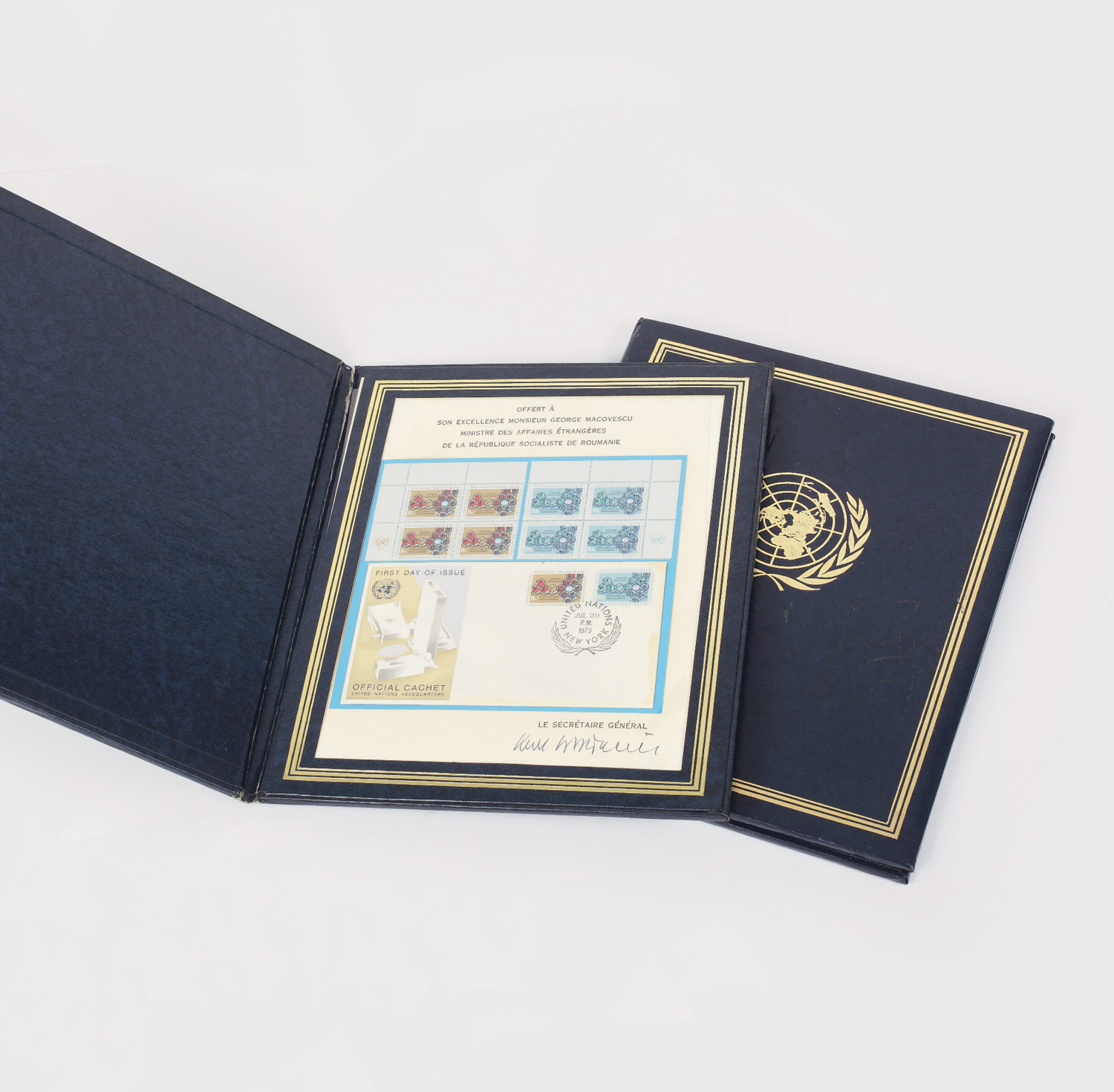 91. Mape cu timbre "Prima zi a emisiunii", oferite cadou ministrului de externe George Macovescu de către Secretarul General al ONU Kurt Walheim, cu semnătura olografă; 1973, 1974, lot format din 2 piese