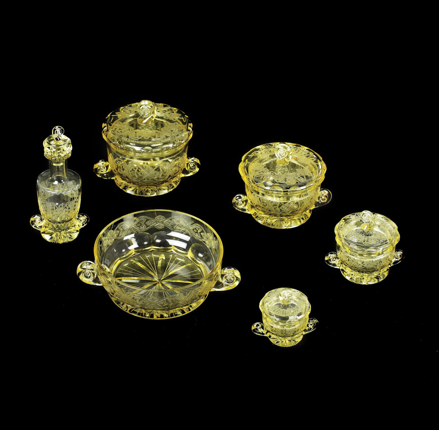 Superbă garnitură de vase pentru servit compusă din patru cupe de mărimi diferite cu capac, un flacon şi o cupă. Piesele din cristal galben citron au forme cilindrice strânse spre bază, marcată de tăieturi adânci în format ovă şi cu anse masive puţin evazate, descriind o volută strânsă. Corpul este decorat cu o friză de motive geometrice inspirate parcă din registrul decorativ popular. Capacele masive reiau decoraţia prezentă pe corp, iar butoanele de prindere, înalte, au profilul anselor. Certificatul emis de APPS atestă faptul că lotul a aparţinut cuplului Ceauşescu.