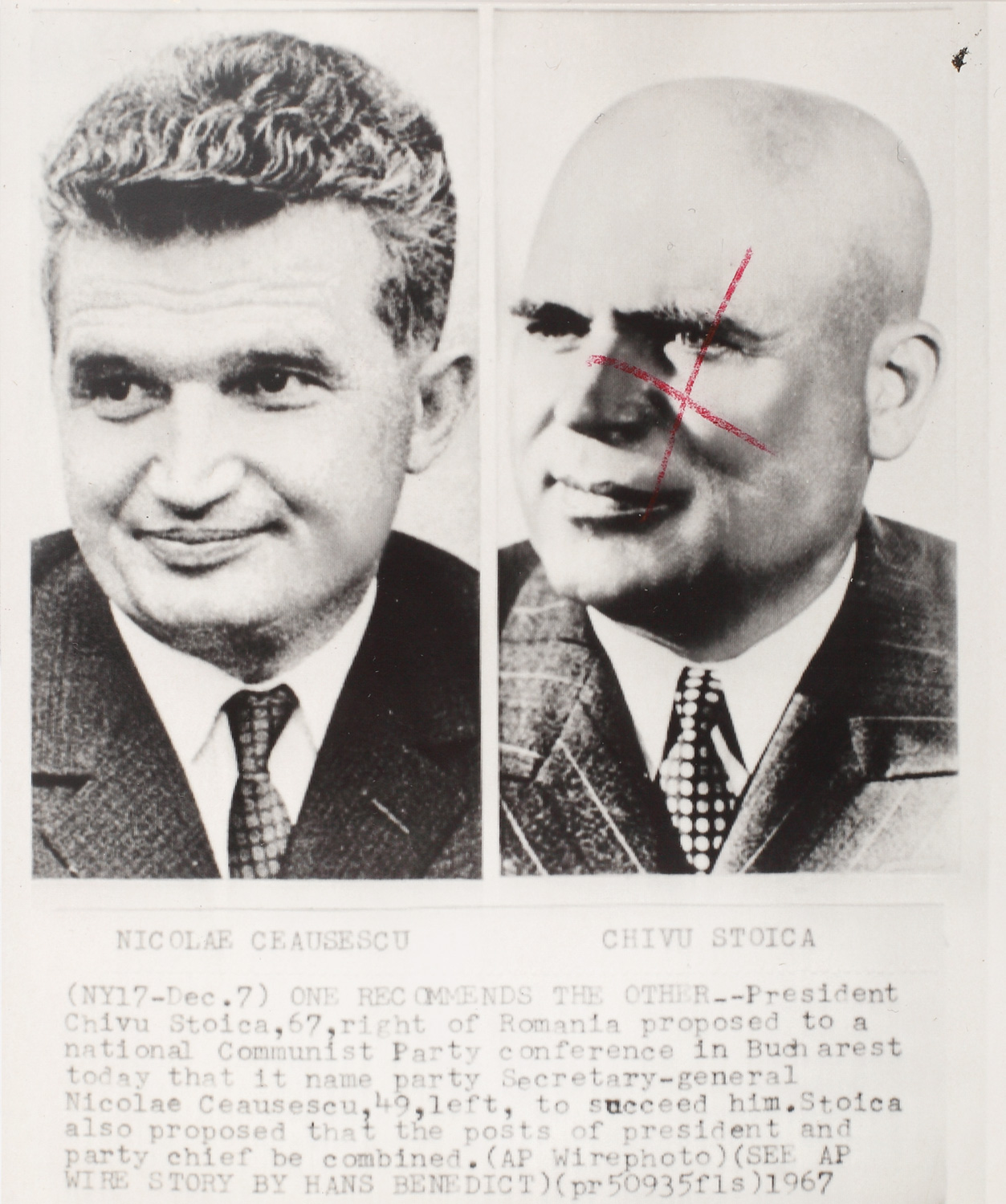 Deşi a fost ales în 1965 ca secretar general al Partidului Comunist Român, Nicolae Ceauşescu era propus de Chivu Stoica ca Preşedinte al Consiliului de Stat în 1967. Această fotografie a fost folosită de presa americană în 1967, într-un articol despre noua conducere a lui Nicolae Ceauşescu şi susţinerea sa în rândurile liderilor Partidului Comunist Român.