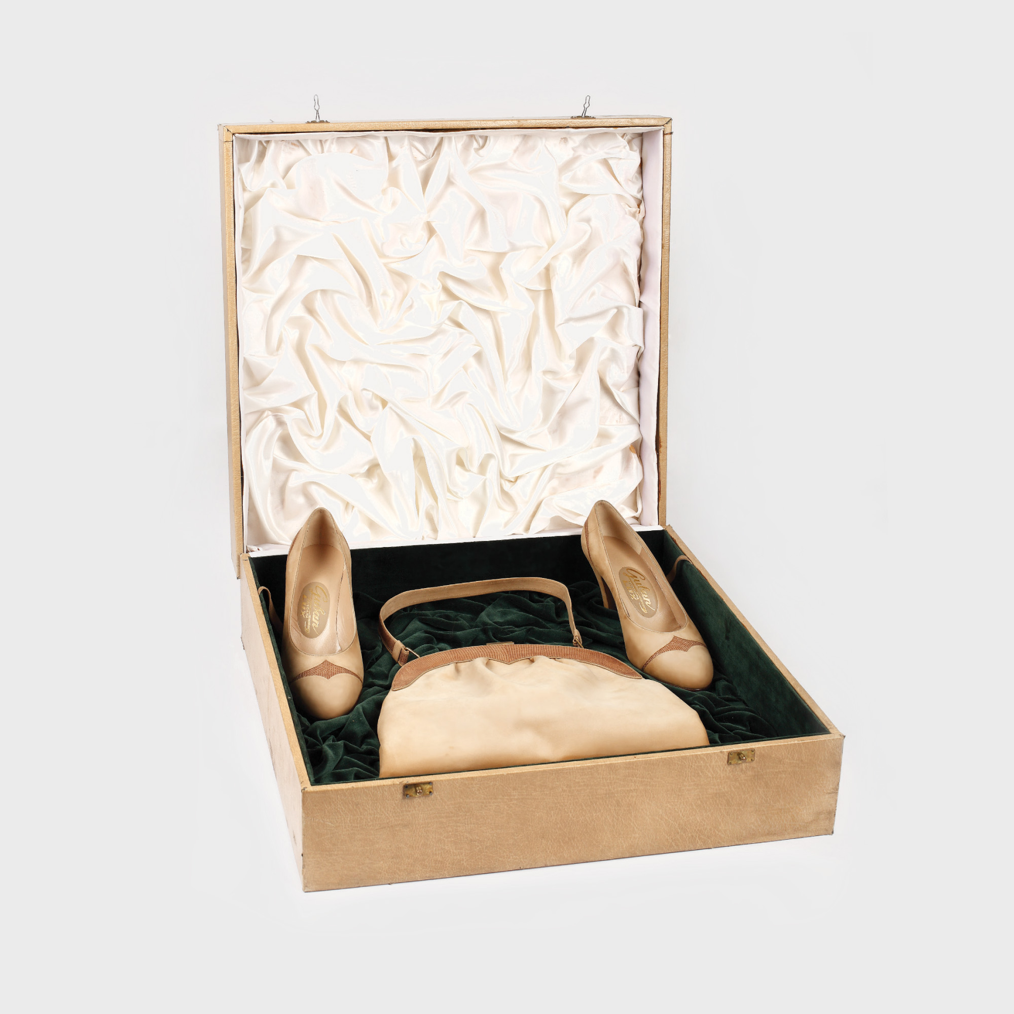 Pantofii marca "Guban" - Timişoara sunt realizaţi dintr-o piele foarte fină, însoţiţi de o geantă confecţionată din acelaşi material. Fondată în anul 1937 ca o mică fabrică de cremă de ghete, compania s-a dezvoltat continuu dar produsul care a adus cu adevarat prestigiu mărcii "Guban" a fost încălţămintea de damă. În anul 1959 a fost lansat primul pantof marca "Guban" pe piaţă. Lucraţi manual, de o calitate impecabilă, pantofii marca "Guban" au reprezentat ani la rând încalţămintea elitei româneşti.