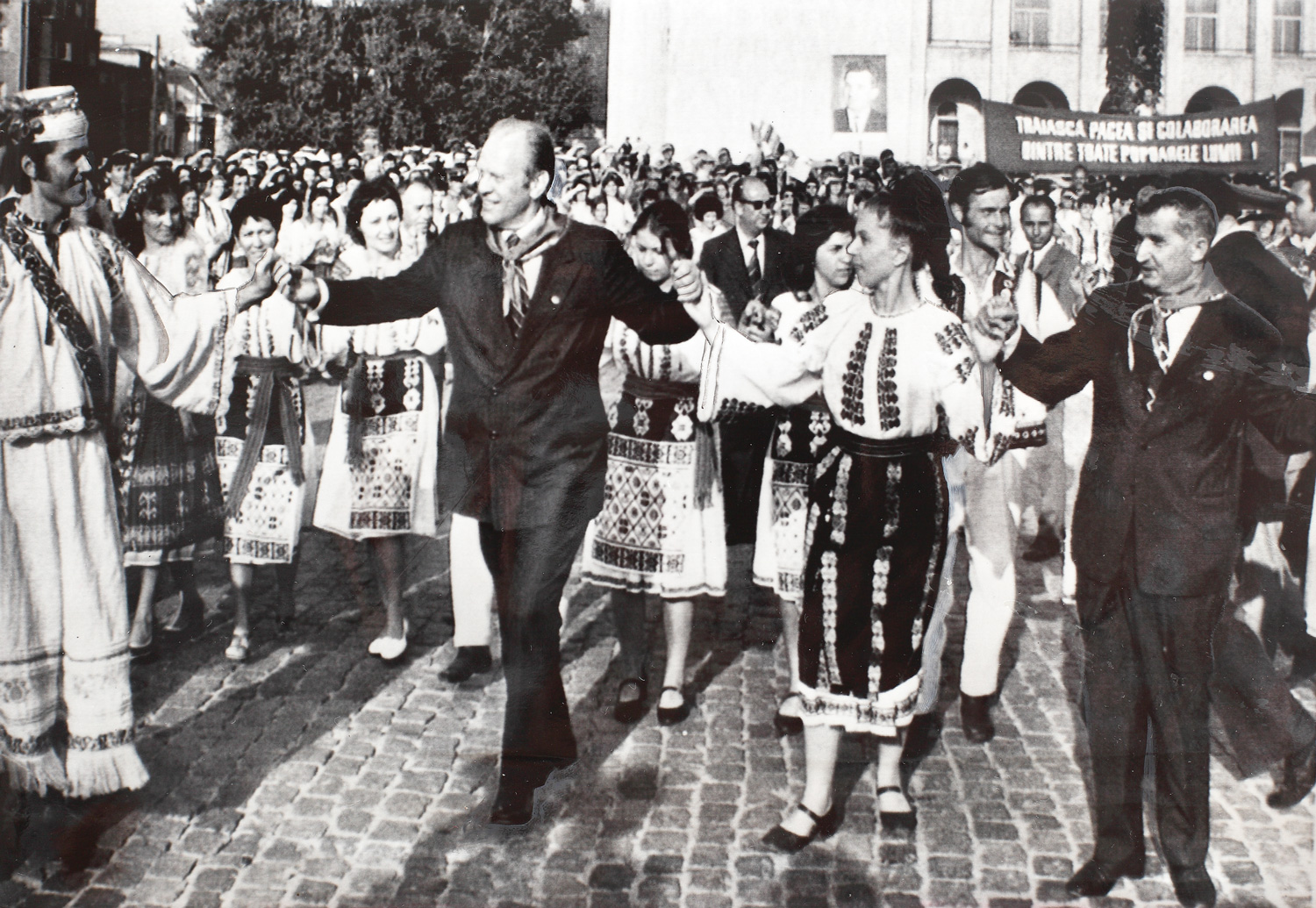 Vizita lui Gerald Ford la Bucureşti în 1975 a urmat Conferinţei de la Helsinki, unde România a participat alături de alte 34 de ţări şi unde s-au dezbătut probleme referitoare la demilitarizarea principalelor puteri şi la îmbunatăţirea relaţiilor diplomatice Est-Vest. Vizita lui Gerald Ford în România a fost prezentată de către propaganda comunistă ca un semn al înţelegerii şi păcii dintre cele două ţări, însă intenţia SUA era una de liberalizare progresivă a României. Pe spatele fotografiei, se află descrierea acesteia din ziarul american în care a fost publicată, menţionând faptul că la ceremonia din Piaţa Victoriei au participat în jur de 230.000 de oameni. Aceste estimări erau desigur false, având în vedere faptul că poporul român nu a mai dat dovadă de acelaşi entuziasm ca în 1969 la vizita lui Richard Nixon la Bucureşti.