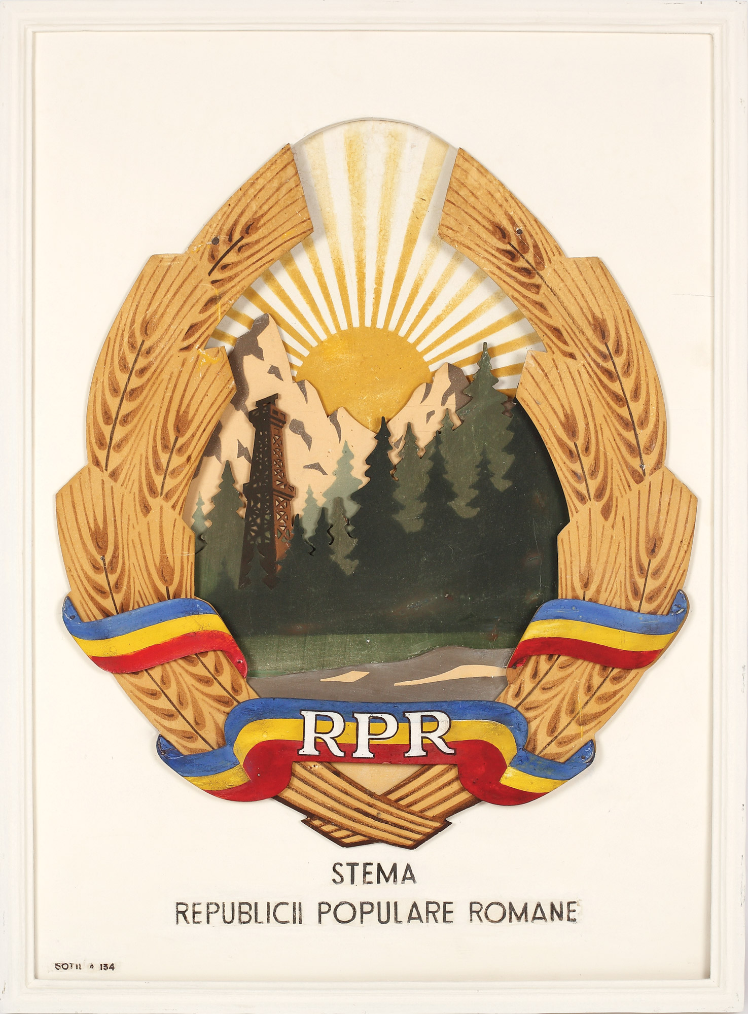 40. Inedită stemă RPR, din plăci de lemn, anii 1950 - 1960