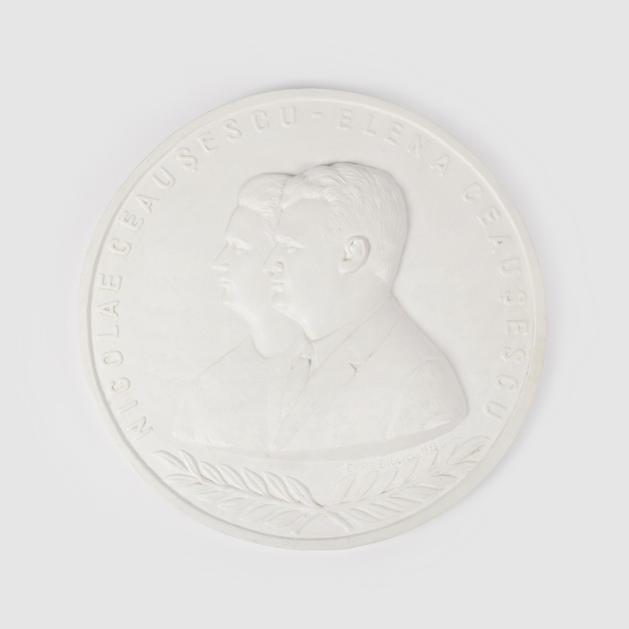 52. Medalion din rigips, cu profilele cuplului Ceauşescu, realizat de Gheorghe Rădulescu, 1978