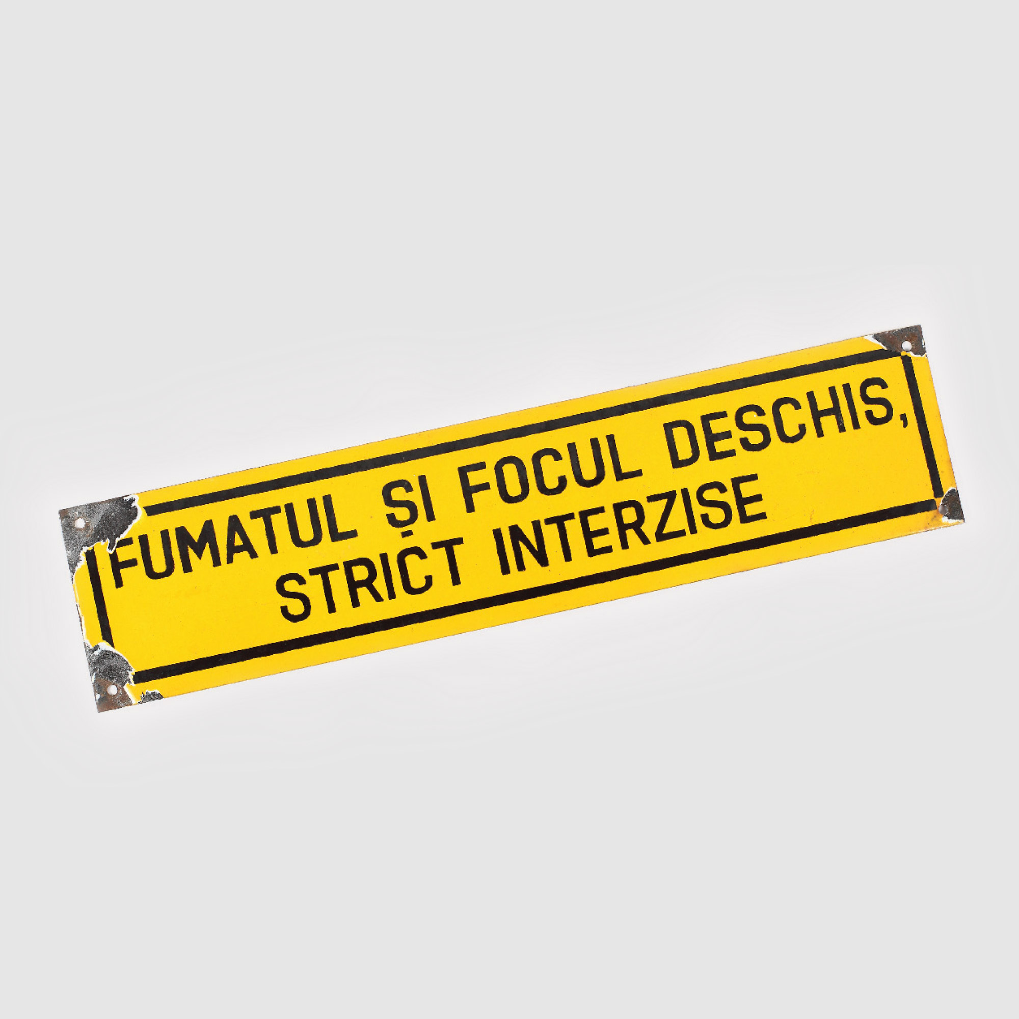 43. Placă emailată, anii 1980, "Fumatul și focul deschis, strict interzise", anii 1980