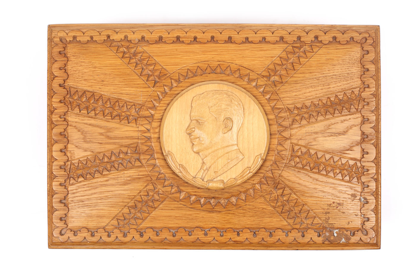 55. Casetă pentru țigări, având sculptat portretul lui Nicolae Ceaușescu, făcută cadou lui Nicolae Ceaușescu de o întreprindere de mobilă