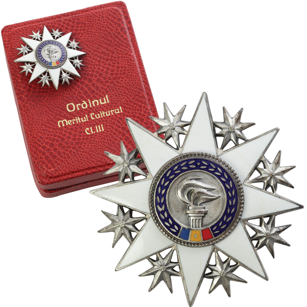 O frumoasă cutie din pergamoid roşu, în interior cu catifea, susţine un exemplar din ordinul “Meritul cultural”, clasa a III-a, instituit în 1964. Opt raze emailate în alb înconjoară o făclie aprinsă, simbolul cunoaşterii.